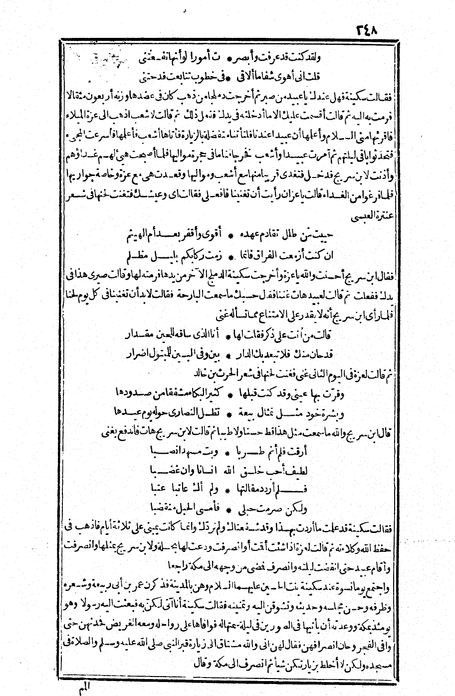واجتمع يوما نسوة عند سكينة بنت الحسين - عليهما السلام- وهن بالمدينة فذكرن عمر بن أبي ربيعة وشعره وظرفه وحسن مجلسه وحديثه وتشوقن إليه وتمنينه فقالت سكينة: أتا آتي لكن به فبعثت إليه رسولا وهو يومئذ بمكة ووعدته أن يأتيها في الصورين في ليلة سمتها له فوافاها على رواحله ومعه الغريض فحدثهن حتى وافى الفجر وحان انصرافهن فقال لهن: إني والله مشتاق إلى زيارة قبر النبي صلى الله عليه وسلم والصلاة في مسجده ولكن لا أخلط بزيارتكن شيئا، ثم انصرف إلى مكة وقال: