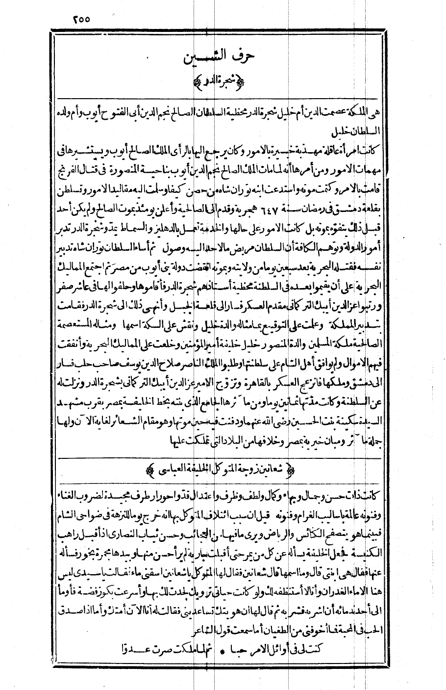 ثم أساء السلطان (توران شاه) تدبير نفسه فتقله البحرية بعد سبعين يوما من ولايته وبموته انقضت دولة بني أيوب من مصر، ثم اجتمع المماليك البحرية على أن يقيموا بعده في السلطنة محظية أستاذهم شجرة الدر فأقاموها وحلفوا لها في عاشر صفر ورتبوا عز الدين أيبك التركماني مقدم العسكر فسار إلى قلعة الجبل، وأنهى ذلك إلى شجرة الدر، فقامت بتدبير المملكة، وعملت على التوقيع بما مثاله والدة خليل، ونقش على السكة اسمها ومثاله المستعصمة الصالحية ملكة المسلمين والدة المنصور خليل خليفة أمير المؤمنين وخلعت على المماليك البحرية، وأنفقت فيهم الأموال ولم يوافق أهل الشام على سلطنتها وطلبوا الملك الناصر صلاح الدين يوسف صاحب حلب، فسار إلى دمشق وملكها فانزعج العسكر بالقاهرة وتزوج الأمير عز الدين أيبك التركماني بشجرة الدر، ونزلت له عن السلطنة وكانت مدتها ثمانين يوما، ومن مآثرها الجامع الذي بنته بخط الخليفة بمصر بقرب مشهد السيدة سكينة بنت الحسين - رضي الله عنهما - ودفنت فيه حين موتها وهو مقام الشعائر لغاية الآن ولها جملة مآثر ومبان خيرية بمصر وخلافها من البلاد التي تملكت عليها.
