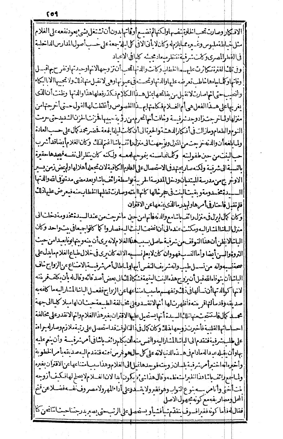 ولما بلغه أن والدته خرجت من المنزل وتوجهت إلى منزل رائف باشا اغتم لذلك وكان الغلام أيضا قد أشرب حب البنت من حين طفوليته، وكلما نما سنه ينمو حبها معه، ولكنه كان ينظر إلة نفسه فيجدها حقيرة بالنسبة إلى شفرية، ولكنه صار يجتهد في الاستحصال على العلوم الكافية لأن تجعله أهلا لها، ولم يمض زمن يسير إلا وخرج من مدرسة المبتديان ودخل المدرسة الحربية بواسطة رائف باشا وبعد مضي مدة توفى الله والدتها السيدة مخدومة، وبقيت البنت في حجر خالها كأنها ابنته، وصارت تطلبها الخطاب منه فيعرض عليها ذلك فلم تقبل فاحتار في أمرها ولم يدر ما الذي يمنعها عن الاقتران.