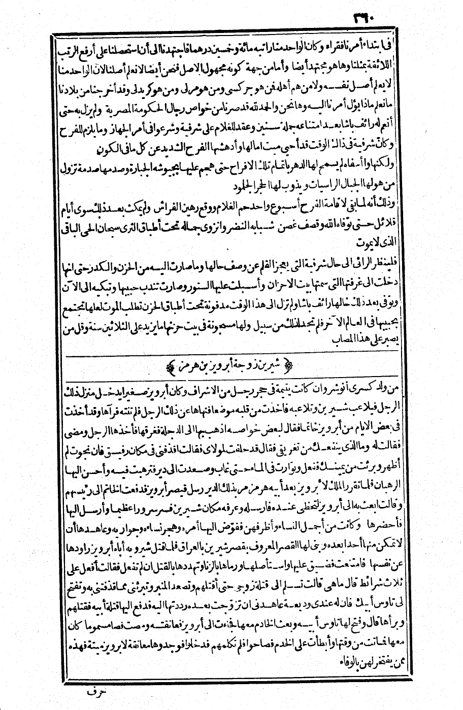 من ولد كسرى أنوشروان. ان يتيمة في حجر رجل من الأشراف، وكان (أبرويز) صغيرا يدخل منزل ذلك الرجل فيلاعب شرين وتلاعبه فأخذت من قلبه موضعا فنهاها عن ذلك الرجل فلم تنته فرآها. وقد أخذت في بعض الأيام من (أبروزير) خاتما فقال لبعض خواصه: اذهب بها إلى الدجلة فغرقها، فأخذها الرجل ومضى فقالت له: وما الذي ينفعك من تغريقي؟ فقال: قد حلفت لمولاي. فقالت: اقذفني في مكان رفيق فإن نجوت لم أظهر وبرئت من يمينك ففعل وتوارت في الماء حتى غاب وصعدت إلى دير فترهبت فيه وأحسن إليها الرهبان.