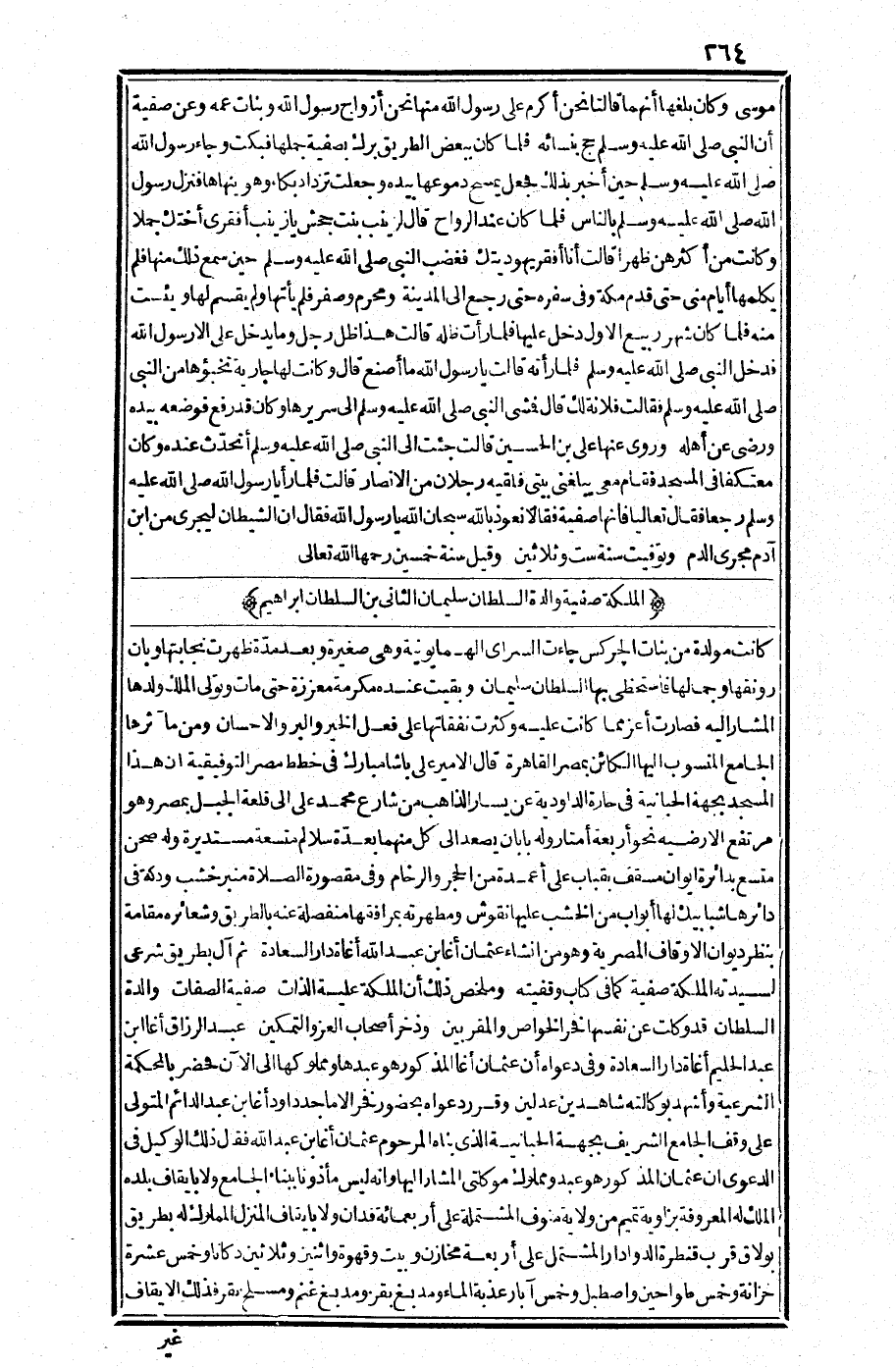 وروى عنها علي بن الحسين قالت: جئت إلى النبي صلى الله عليه وسلم أتحدث عنده وكان معتكفا في المسجد فقام معي يبلغني بيتي فلقيه رجلان من الأنصار قالت: فلما رأيا رسول الله صلى الله عليه وسلم رجعا فقال: (تعاليا فإنها صفية) . فقالا: نعوذ بالله سبحان الله يا رسول الله! فقال: (إن الشيطان ليجري من ابن آدم مجرى الدم) . وتوفيت سنة ست وثلاثين. وقيل: سنة خمسين - رحمها الله تعالى.