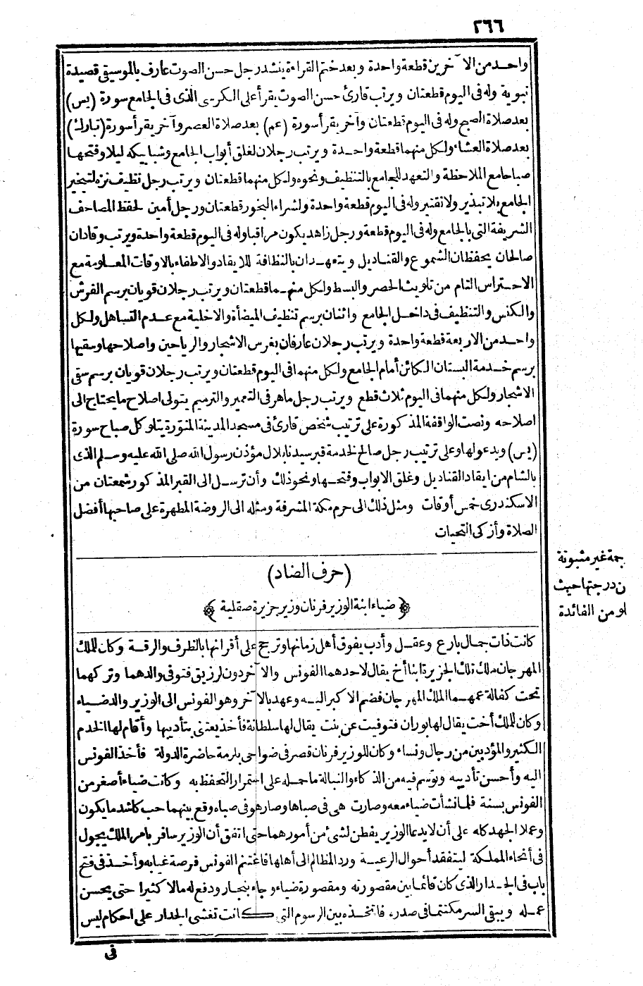 ونصت الواقفة - المذكورة- على ترتيب شخص قارئ في مسجد المدينة المنورة يتلو كل صباح سورة (يس) ويدعو لها. وعلى ترتيب رجل صالح لخدمة قبر سيدنا بلال مؤذن رسول الله صلى الله عليه وسلم الذي بالشام من إيقاد القناديل وغلق الأبواب وفتحها ونحو ذلك. وأن ترسل إلى القبر - المذكور - شمعتان من الإسكندري خمسة أوقات، ومثل ذلك إلى حرم مكة المشرفة، ومثله إلى الروضة المطهرة على صاحبها أفضل الصلاة وأزكى التحيات.