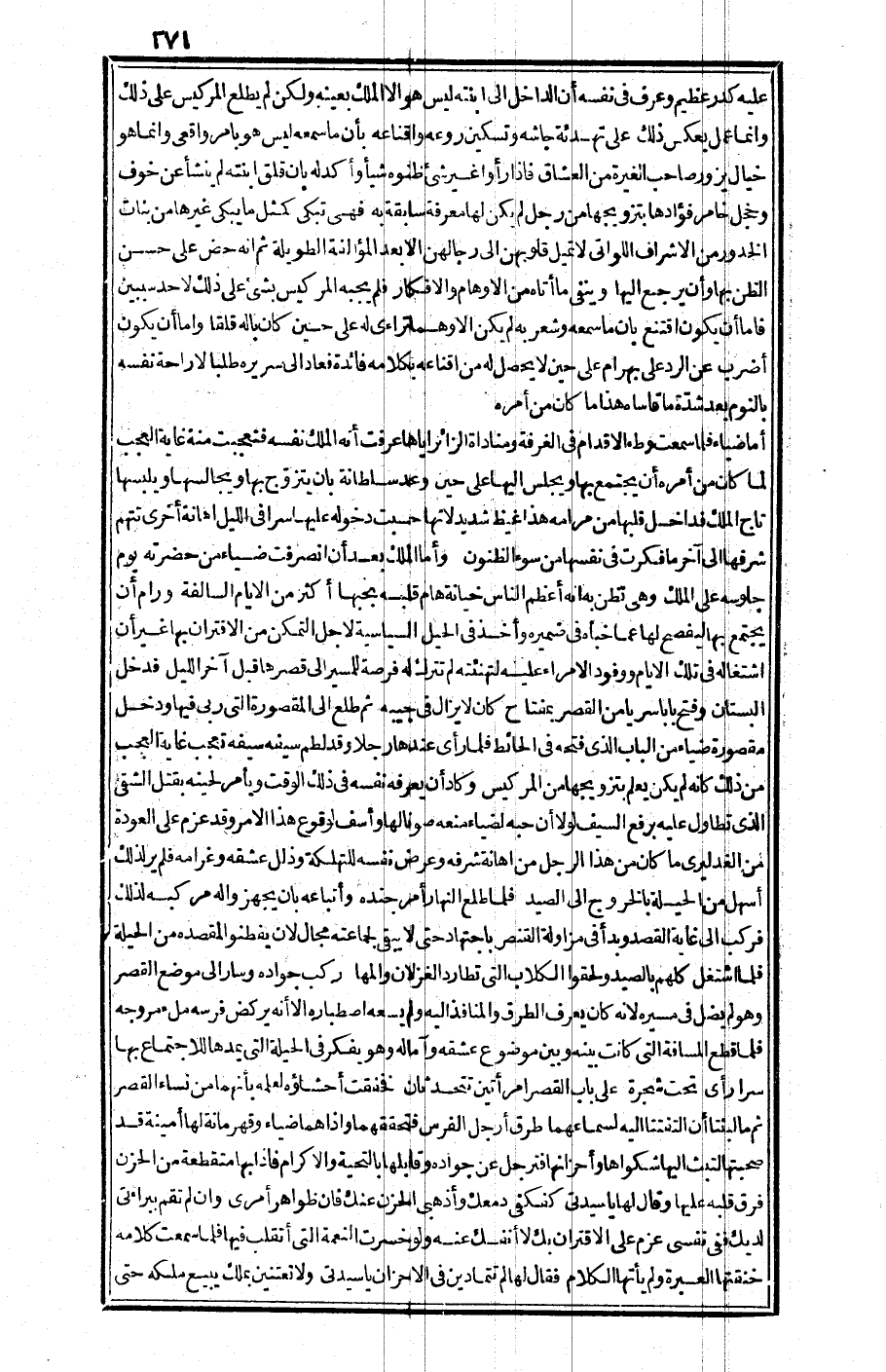 فلما اشتغل كلهم بالصيد ولحقوا الكلاب التي تطارد الغزلان والمها ركب جواده وسار إلى موضع القصر وهو لم يضل في مسيره لأنه كان يعرف الطرق والمنافذ إليه ولم يسعه اصطباره إلا أنه يركض فرسه ملء مروجه، فلما قطع المسافة التي كانت بينه وبين موضوع عشقه وآماله وهو يفكر في الحيلة التي يمدها للاجتماع بها سرا رأى تحت شجرة على باب القصر امرأتين تتحدثان فخفقت أحشاؤه لعلمه بأنهما من نساء القصر ثم ما لبثنا أن التفتتا إليه لسماعهما طرق أرجل الفرس فتحققهما وإذا هما ضياء وقهرمانة لها أمينة قد صحبتها لتبث إليها شكواها وأحزانها، فترجل عن جواده وقابلها بالتحية والإكرام فإذا بها متقطعة من الحزن فرق قلبه عليها.
