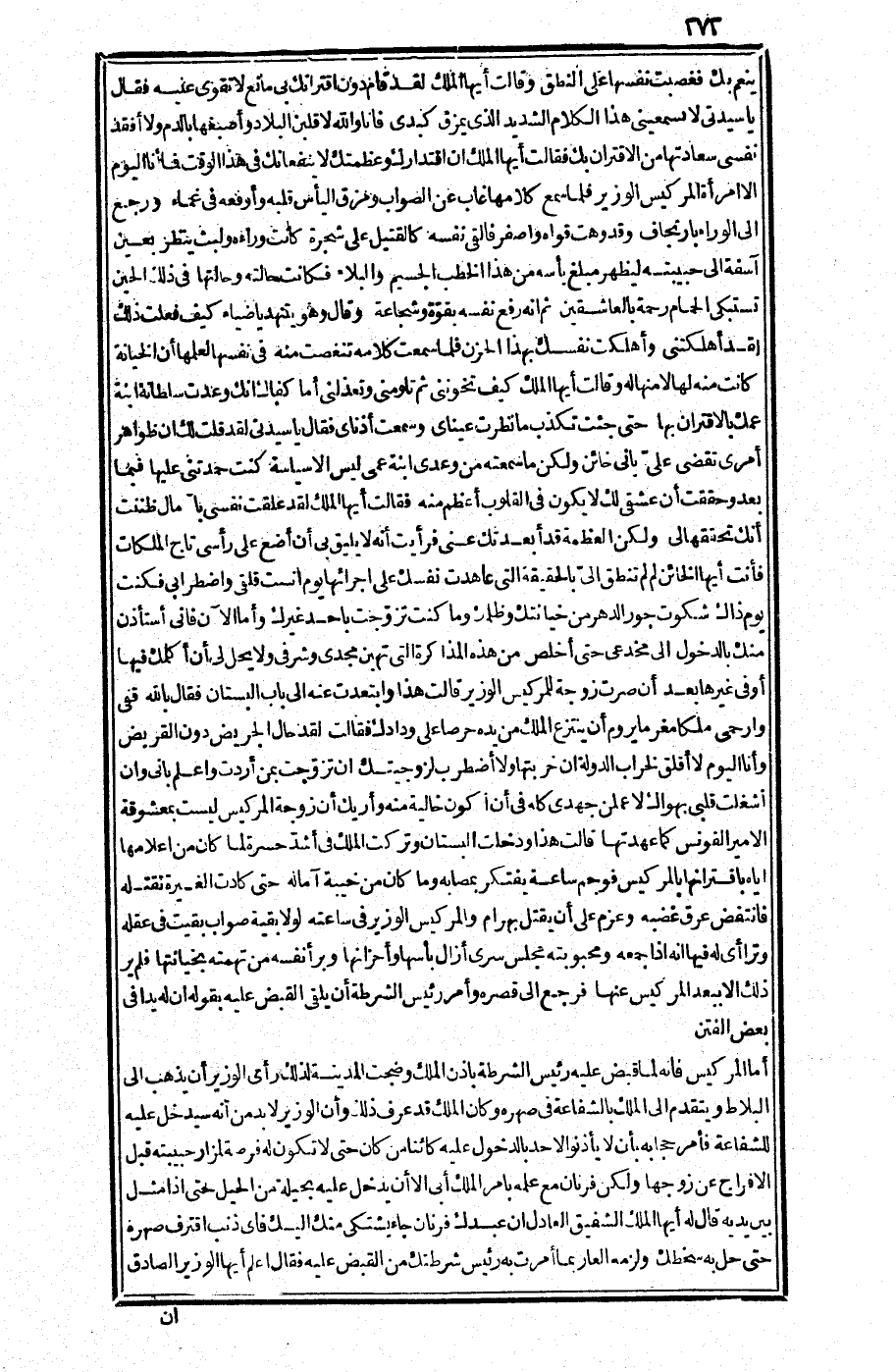 واعلم بأني وإن أشغلت قلبي بهواك لأعملن جهدي كله في أن أكون خالية منه وأريك أن زوجة المركيس ليست معشوقة الأمير (ألفونس) كما عهدتها، قالت هذا ودخلت البستان وتركت الملك في أشد حسرة لما كان من إعلامها إياها باقترانها بالمركيس فوجم ساعة يفتكر بمصابه وما كان من خيبة آماله حتى كادت الغيرة تقتله فانتفض عرق غضبه وعزم على أن يقتل (بهرام) والمركيس الوزير في ساعته لولا بقية صواب بقيت في عقله وتراءى له فيها أنه إذا جمعه ومحبوبته مجلس سري أزال يأسها وأحزانها وبرأ نفسه من تهمته بخيانتها فلم ير ذلك إلا ببعد المركيس عنها، فرجع إلى قصره وأمر رئيس الشرطة أن يقلي القبض عليه بقوله: أن له في بعض الفتن.