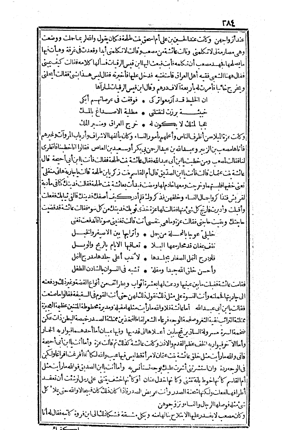 عند أزواجهن وكانت عند الحسين بن علي أم إسحاق بنت طلحة فكان يقول: والله لربما حملت ووضعت وهي مصارمة لي لا تكلمني، ونالت عائشة من مصعب وقالت: لا تكلمني أبدا وقعدت في غرفة وهيأت فيها ما يصلحها فجهد مصعب أن تكلمه، فأبت، فبعث إليها ابن قيس الرقيات فسألها كلامه.