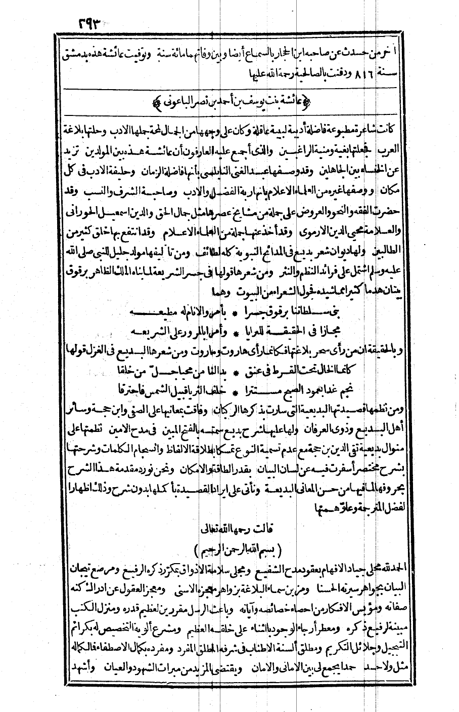 ومن نظمها قصيدتها البديعية التي سارت بذكرها الركبان، وفاقت بمعانيها على الصفي وابن حجة وسائر أهل البديع وذوي العرفان، ولها عليها شرح بديع سمته بالفتح المبين في مدح الأمين نظمتها على منوال بديعية تقي الدين بن حجة مع عدم تسمية النوع تمسكا بطلاقة الألفاظ، وانسجام الكلمات، وشرحتها بشرح مختصر أسفرت فيه عن لسان البيان بقدر الطاقة والإمكان، ونحن نورد مقدمة هذا الشرح بحروفها لما فيها من حسن المعاني البديعة وتأتي على إيراد القصيدة بأكملها بدون شرح وذلك إظهارا لفضل المترجمة وعلو همتها. قالت رحمها الله تعالى: