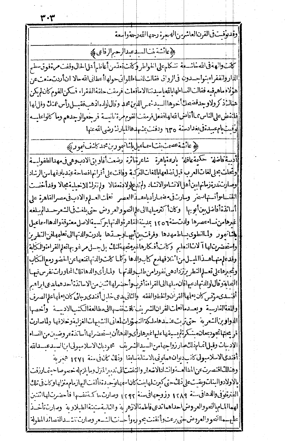أديبة فاضلة، حكيمة عاقلة، بارعة باهرة، شاعرة ناثرة، رضعت أفاويق الأدب وهي في مهد الطفولية وتحلت بحلى لغات العرب قبل تضلعها باللغات التركية، وفاقت على أقرانها فصاحة عند بلوغها سن الرشاد، وصارت ندرة زمانها بين أهل الإنشاء والإنشاد، ولم تدع لولادة مقالا، ولم تترك للأخيلية مجالا، وقد أخنست الخنساء وأنستها صخر، وسارت في مضمار أدباء هذا العصر.