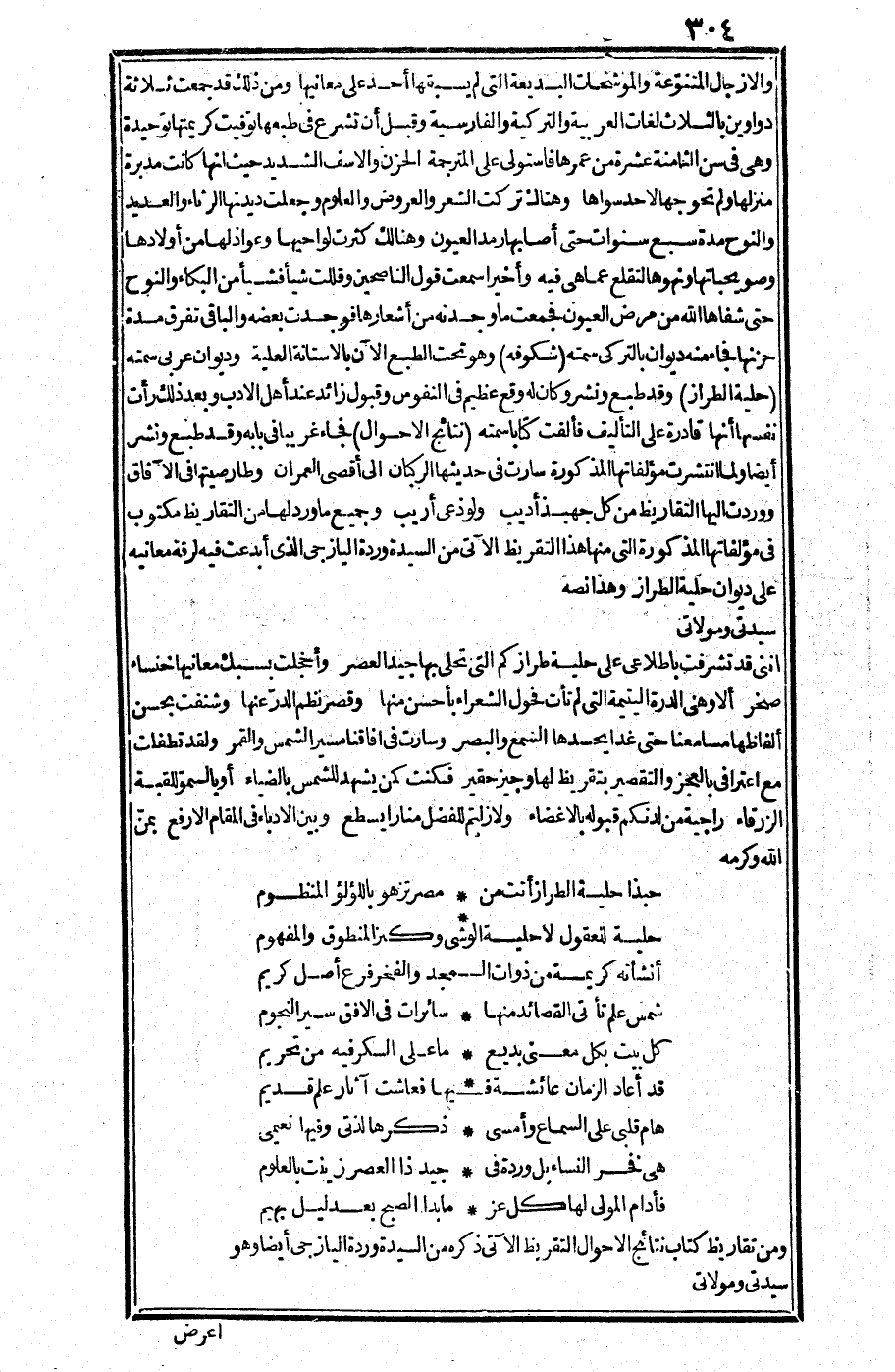 (سيدتي ومولاتي، إنني قد تشرفت باطلاعي على حلية طرازكم التي تحلى بها جيد العصر، وأخجلت بسبك معانيها خنساء صخر، ألا وهي الدرة اليتيمة التي لم تأت فحول الشعراء بأحسن منها، وقصر نظم الدر عنها، وشنفت بحسن ألفاظها مسامعنا حتى غدا يحسدها السمع والبصر، وسارت في آفاقنا مسير الشمس والقمر، ولقد تطفلت مع اعترافي بالعجز والتقصير بتقريظ لها وجيز حقير، فكنت كمن يشهد للشمس بالضياء، أو بالسمو للقبة الزرقاء، راجية من لدنكم قبوله بالإغضاء، ولا زلتم للفضل منارا يسطع، وبين الأدباء في المقام الأرفع بمن الله وكرمه: