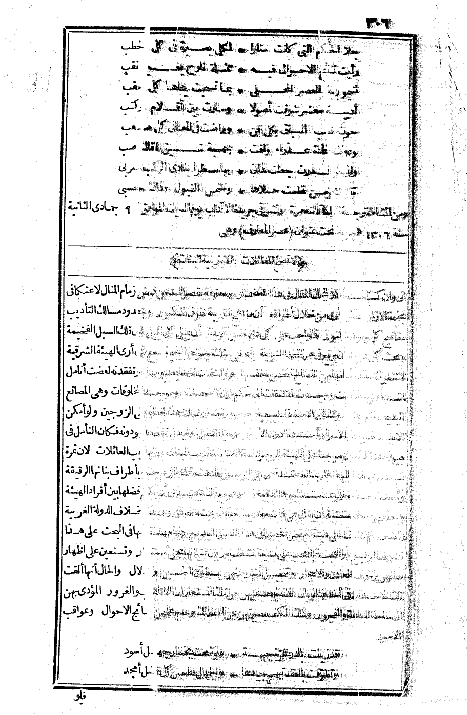 (إني وإن كنت لست أهلا لمجال المقال في هذا المضمار ومعترفة بقصر اليد عن قبض زمام المنال لاعتكافي بخيمة الإزار، لكني أرى من خلال أطرافه أن مناهج التربية ظرف الكنوز وبحدود مسالك التأديب مفاتيح كل جوهر مكنوز، فالواجب على كل ذي نفس كريمة أن يميل كل الميل إلى تلك السبل الفخيمة ويحث كل عزيز له أن يرتع في مراتعها القويمة ليحظى بتلك الجواهر اليتيمة مع أني أرى الهيئة الشرقية لا تنظر إلا ما هو أمامها من الصالح فتحض به نفسها، ولو التفت إلى ما بعد يومها وتفقدته لعضت أنامل الندم على ما فرطت ووجدت بالالتفات إلى حكم بارئ النسمات، وموجد المخلوقات، وهي المصانع البديعة الربانية، والمباني الأصيلة الطبيعية صيرورة مدار عمران هذا العالم على الزوجين ولو أمكن الانفراد لخص عالم الأسرار أحدهما دون الآخر وهو الأفضل ولم يفقره إلى ما هو دونه، فكان التأمل في هيولى هذا الكون موجبا على الهيئة الرجولية العناية بتأديب البنات وتهذيب العائلات، لأن ثمرة الؤدد راجعة إليها، فلربما إنه قعد أمر الرجل فأدهشه، فلمته الزوجة بأطراف بناتها الرقيقة وأخمدت جذوة ولوعه بتدابيرها الدقيقة، وهو مع ذلك يجتهد في أن يكتم فضلها بين أفراد الهيئة ويحذر من إعلانه خشية أن يقال: هي ذات معلومية، فيكدر عيشه الصافي وهذا بخلاف الدولة الغربية فالأسف ثم الأسف على هيئة لم تمض فحصها في هذا النسق البديع ولم تجهد نفسها في البحث على هذا الشرف الرفيع، والعجب ثم العجب على مدينة تشغف بتزيين فتياتها بحلي مستعار، وتستعين على إظهار جمالهن بزخرف المعادن والأحجار، وتتخيل أنها زادتهن بسطة في الحسن والدلال، والحال أنها ألقت تلك الأحداث في أخدود الوبال، لأنه لم يعد عليهن من تلك المستعارات إلا العجب والغرور المؤدي بهن إلى ساحة المباهاة والفجور، وذلك لكف بصيرتهن عن الإدراك وعدم علمهن بنتائج الأحوال، وعواقب الأمور.