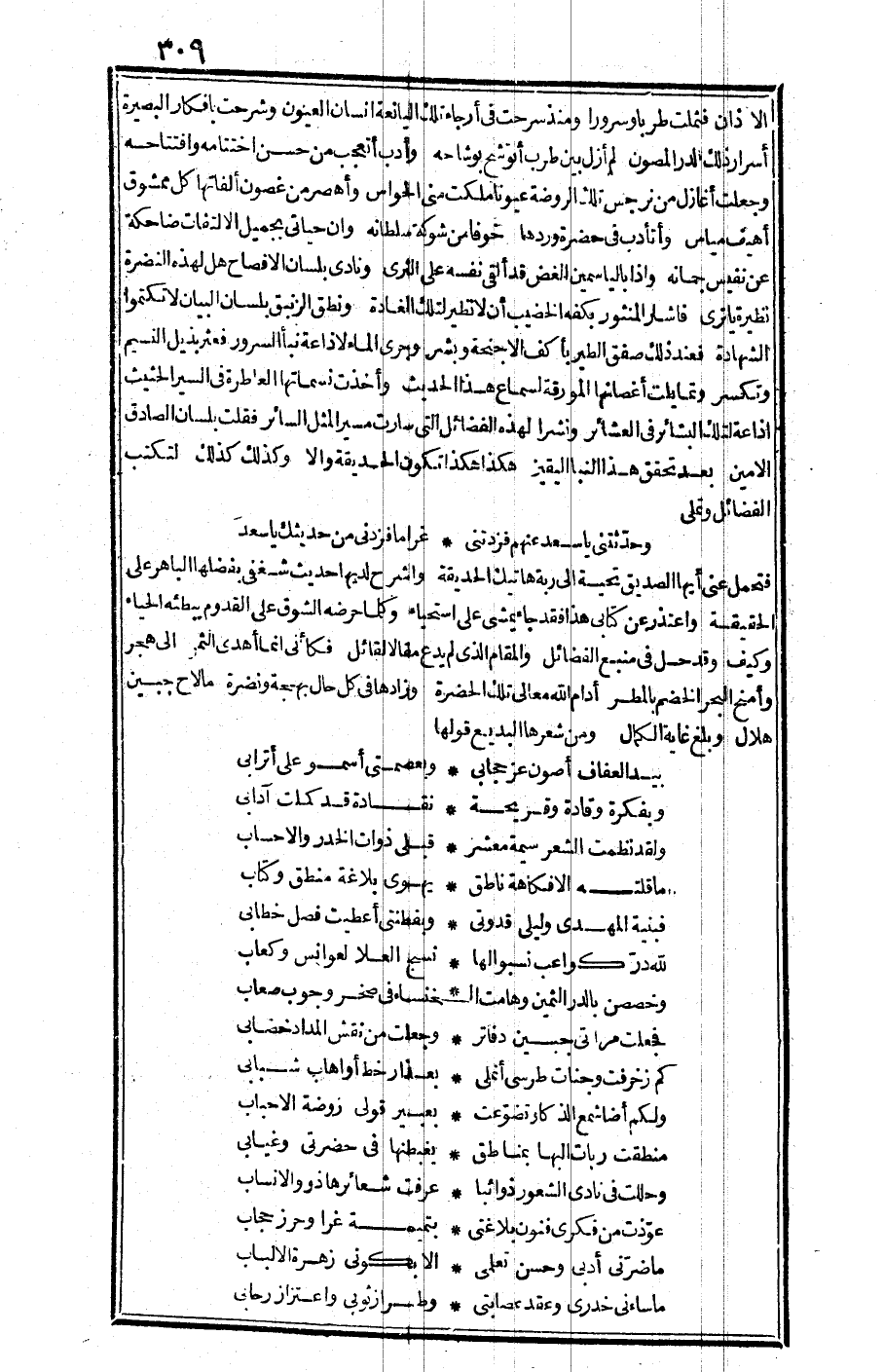 ومنذ سرحت في أرجاء تلك اليانعة إنسان العيون، وشرحت بأفكار البصيرة أسرار ذلك الدر المصون لم أزل بين طرب أتوشح بوشاحه، وأدب أتعجب من حسن اختتامه وافتتاحه وجعلت أغازل من نرجس تلك الروضة عيونا ملكت مني الحواس وأهصر من غصون ألفاتها كل ممشوق أهيف مياس، وأتأدب في حضرة وردها خوفا من شوكة سلطانه، وإن حياتي بجميل الالتفات ضاحكة عن نفيس جمانه، وإذا بالياسمين الغض قد ألقى نفسه على الثرى ونادى بلسان الإفصاح هل لهذه النضرة نظيرة يا ترى، فأشار المنثور بكفة الخضيب أن لا نظير لتلك الغادة، ونطق الزنبق بلسان البيان لا تكتموا الشهادة، فعند ذلك صفق الطير بأكف الأجنحة وبشر وجرى الماء لإذاعة نبأ السرور، فعثر بذيل النسيم وتكسر، وتمايلت أغصانها المورقة، لسماع هذا الحديث، وأخذت نسماتها العاطرة في السير الحثيث إذاعة لتلك البشائر في العشائر ونشرا لهذا الفضائل التي سارت مسير المثل السائر، فقلت بلسان الصادق الأمين بعد تحقق هذا النبأ اليقين هكذا هكذا تكون الحديقة وإلا وكذلك لتكتب الفضائل وتملي: