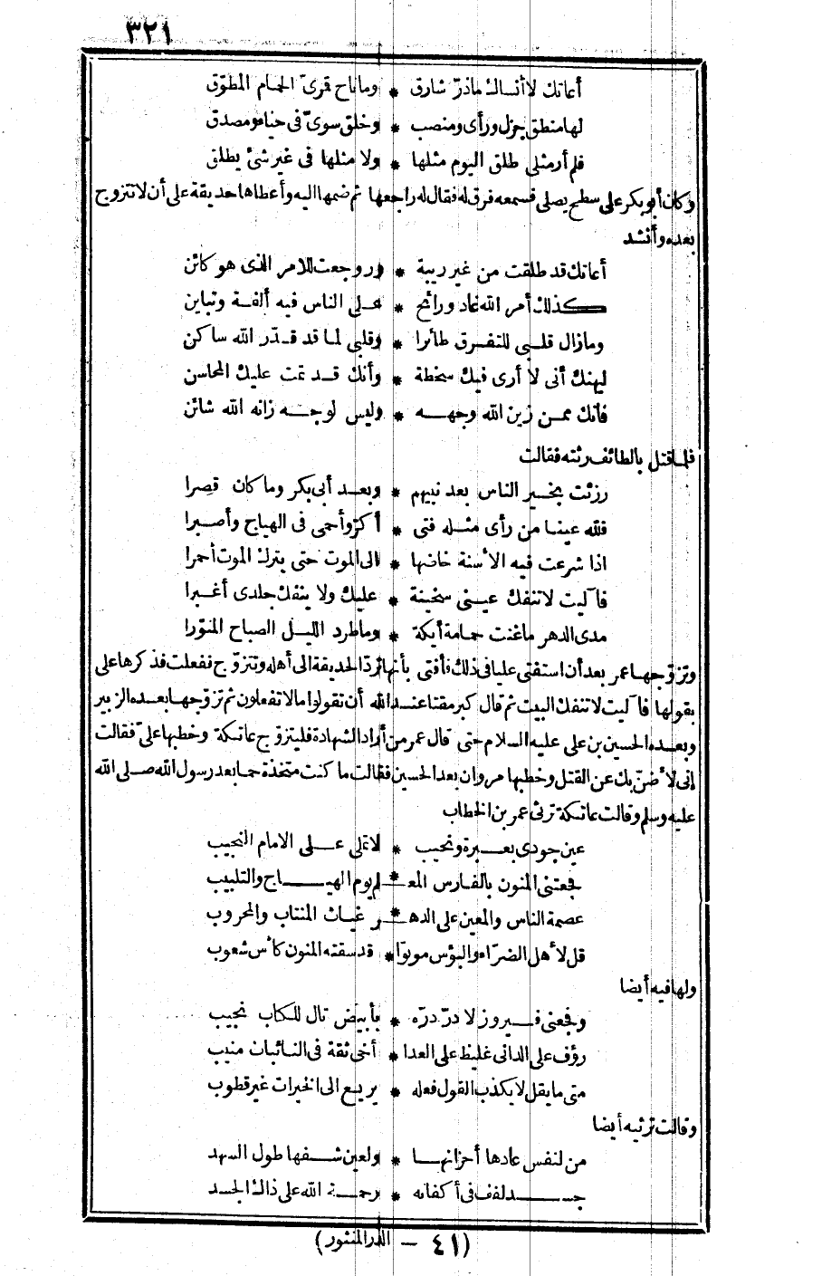 وكان أبو بكر على سطح يصلي فسمعه فرق له فقال له: راجعها، ثم ضمها إليه وأعطاها حديقة على أن لا تتزوج بعده وأنشد: