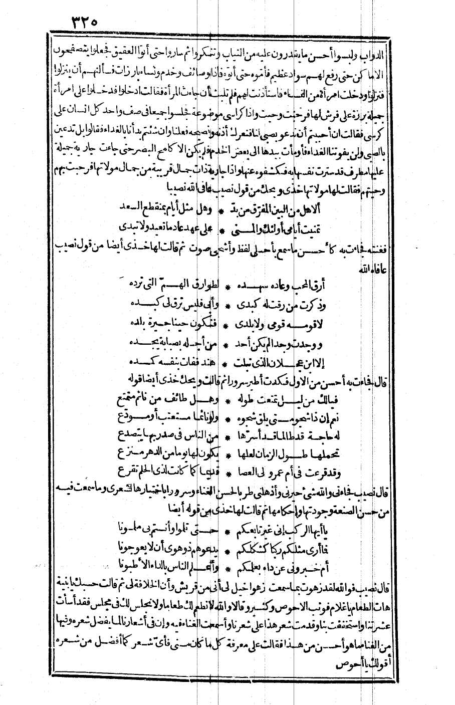 فقالت: إن أحببتم أن تدعو بصبي لنا فنعرك أذنه ونصيحة فعلنا وإن شئتم بالغداء فقالوا: بل تدعين بالصبي ولن يفوتنا الغداء فأومأت بيدها إلى بعض الخدم فلم يكن إلا كلمح البصر حتى جاءت جارية جميلة عليها مطرف قد سترت نفسها به فكشفوه عنها وإذا جارية ذات جمال قريبة من جمال مولاتها فرحبت بهم وحيتهم فقالت لها مولاتها: خذي ويحك من قول نصيب عافى الله نصيبا.