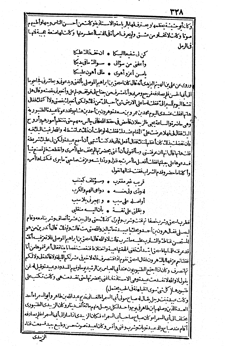فطرب إسحاق وشرب نصفا، ثم غنت وشرب، ولم يزل كذلك حتى والى بين عشرة أنصاف وشربنا معه، وقام ليصلي فقال هارون بن أحمد: ويحك يا عبيدة، ما تبالين والله متى مت قالت: ولم ذلك؟ قال: أتدرين من هو المستحسن غناءك والشارب عليه ما شرب قالت: لا والله. قال إسحاق بن إبراهيم الموصلي فلا تعرفينه أنك قد عرفته، فلما جاء إسحاق ابتدأت تغني فلحقتها هيبة واختلاط فنقصت نقصانا بينا فقال: أعرفتموها من أنا؟ فقلنا: نعم عرفها إياك هارون. فقال إسحاق: نقوم إذا فننصرف إنه لا خير في عشرتكم الليلة ولا فائدة لي ولا لكم، ثم انصرف وكان إذا اجتمع الطنبوريون عند أبي العباس بن الرشيد يوما وفيهم المسدود وعبيدة وقيل له: عن تقول: لا والله لا تقدمت عبيدة وهي الأستاذة فما غنى بحضرتها حتى تقدمت هي وكانت تكتب على طنبورها:
