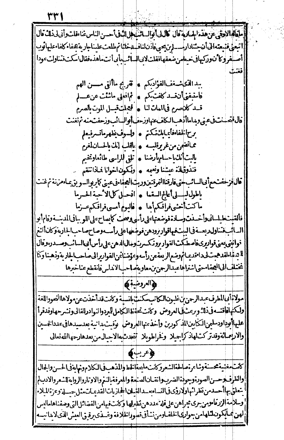 فألقيت طيلساني وأخذت وسادة فوضعتها على رأسي وصحت كما يصاح على اللوبيا في المدينة، وقام أبو السائب فتناول ربعة في البيت فيه القوارير ودهن فوضعها على رأسه وصاح صاحب الجارية، وكان - ألثغا- قوانيني (يعني قواريري) فاصطكت القوارير وتكسرت وسال الدهن على رأس أبي السائب وصدره وقال للعجفاء: لقد هجت لي داء قديما، ثم وضع الربعة على رأسه وعوضنا ثمن القوارير إلى صاحب الجارية وذهبنا وكنا نختلف إلى العجفاء حتى اشتراها عبد الرحمن بن معاوية صاحب الأندلس فانقطع عنا خبرها.