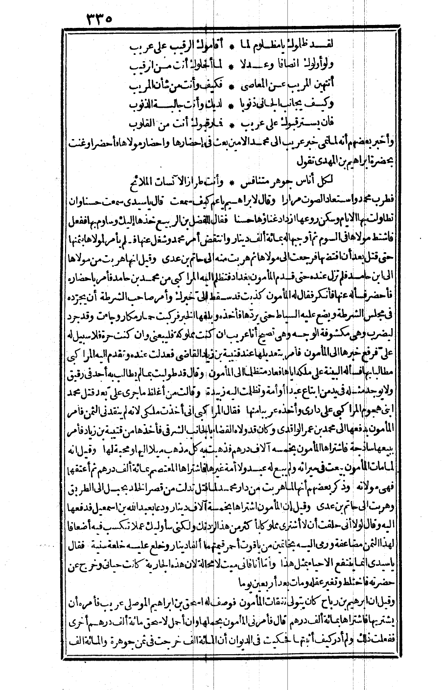 وأخبر بعضهم أنه لما نمى خبر عريب إلى محمد الأمين بعث في إحضارها وإحضار مولاها فأحضر وغنت بحضرة إبراهيم بن المهدي تقول: