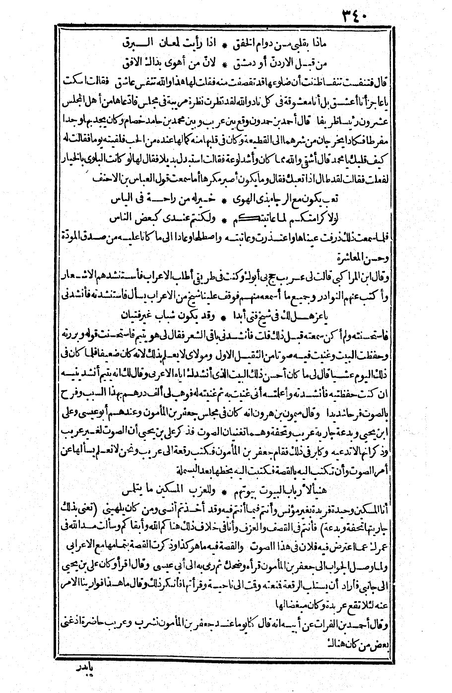أنا المسكين وحيدة فريدة بغير مؤنس وأنتم فيه وقد أخذتم أنسي ومن كان يلهيني (تغني بذلك جاريتها تحفة وبدعة) فأنتم في القصف والعزف وأنا في خلاف ذلك هناكم الله وأبقاكم، وسألت مد الله في عمرك عما اعترض فيه فلان في هذا الصوت والقصة فيه ما هو كذا وذكرت القصة بتمامها مع الأعرابي ولما وصل الجواب إلى جعفر بن المأمون قرأه وضحك، ثم رمى به إلى أبي عيسى وقال: اقرأ وكان علي بن يحيى إلى جانبي فأراد أن يستلب الرقعة فمنعته وقمت إلى ناحية وقرأتها فأنكر ذلك وقال: ما هذا فوارينا الأمر عنه لئلا تقع عربدة وكان مبغضا لها.