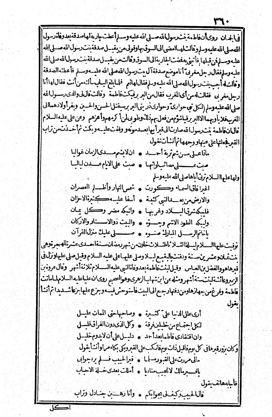 في الجمان: روي أن فاطمة بنت رسول الله صلى الله عليه وسلم أعطت جارية لها صدقة بعد وفاة رسول الله صلى الله عليه وسلم وقالت لها: امضي إلى السوق بها وقولي من يقبل صدقة بنت رسول الله صلى الله عليه وسلم فمن قبلها فأتني به فمضت الجارية إلى السوق وقالت: من يقبل صدقة بنت رسولا لله صلى الله عليه وسلم؟ فقال رجل مغربي: أنا موضع صدقة آل بيت رسول الله صلى الله عليه وسلم، فأعطته الصدقة وقالت له: أجب بنت رسول الله صلى الله عليه وسلم فقال لها نعم.