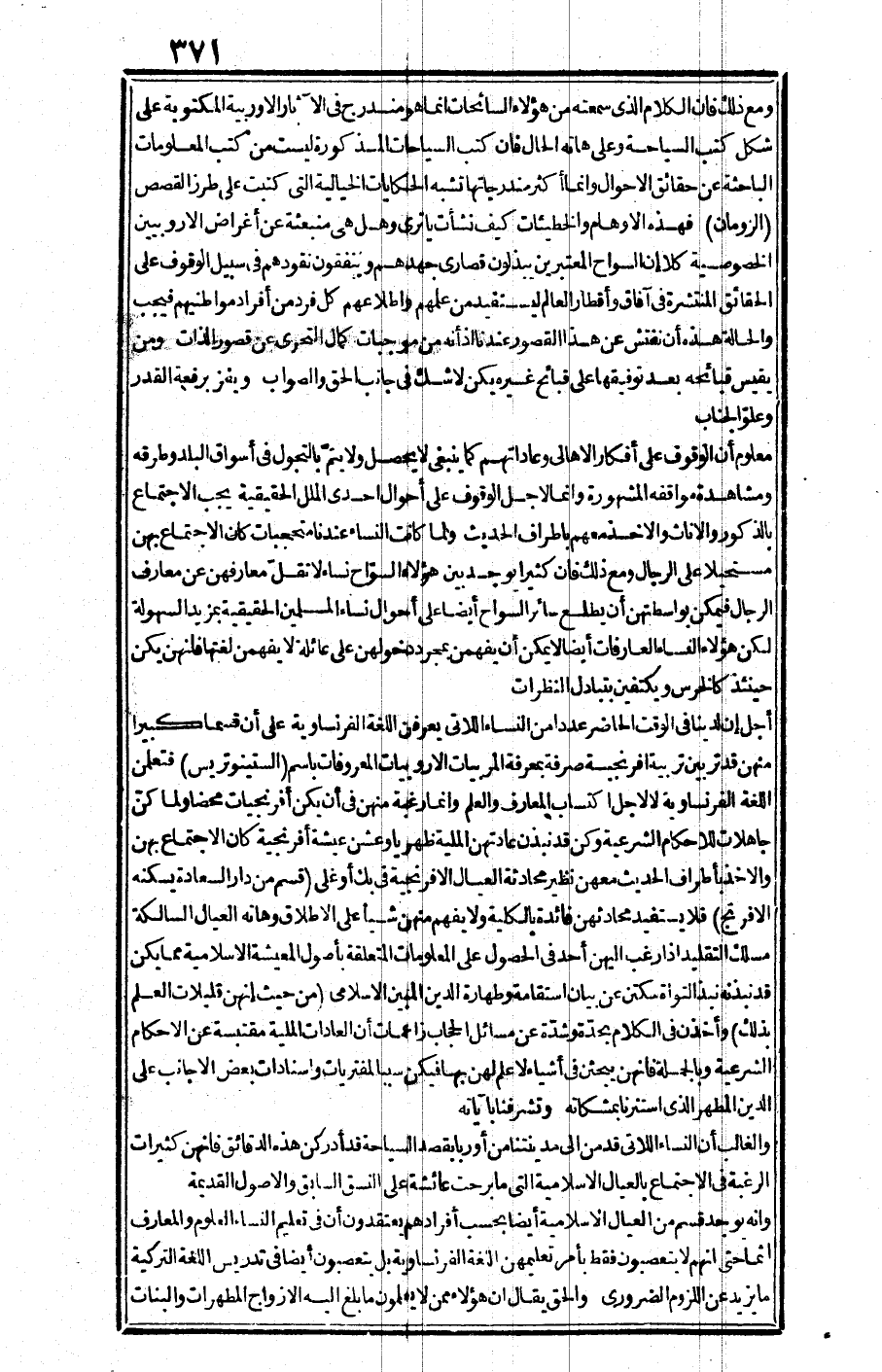 أجل إن لدينا في الوقت الحاضر عددا من النساء اللاتي يعرفن اللغة الفرنساوية على أن قسما كبيرا منهن قد تربين تربية إفرنجية صرفة بمعرفة المربيات الأوروبيات المعروفات باسم "الستينوتريس" فتعلمن اللغة الفرنساوية لا لأجل اكتساب المعارف والعلم، وإنما غربة منهن في أن يكن إفرنجيات محضا، ولما كن جاهلات للأحكام الشرعية وكن قد نبذن عادتهن الملية ظهريا وعشن عيشة إفرنجية كان الاجتماع بهن والأخذ بأطراف الحديث معهن نظير محادثة العيال الإفرنجية في (بك أوغلي) (قسم من دار السعادة يسكنه الإفرنج) فلا يستفيد محادثتهن فائدة بالكلية ولا يفهم منهن شيئا على الإطلاق، وهاته العيال السالكة مسلك التقليد إذا رغب إليهن أحد في الحصول على المعلومات المتعلقة بأصول المعيشة الإسلامية مما يكن قد نبذته نبذ التواة سكتن عن بيان استقامة وطهارة الدين المبين الإسلامي (من حيث إنهن قليلات العلم بذلك) وأخذن في الكلام بحدة وشدة عن مسائل الحجاب زاعمات أن العادات الملية مقتبسة عن الأحكام الشرعية وبالجملة فإنهن يبحثن في أشياء لا علم لهن بها فيكن سببا لمفتريات وإسنادات بعض الأجانب على الدين المطهر الذي استنرنا بمشكاته وتشرفنا بآياته.