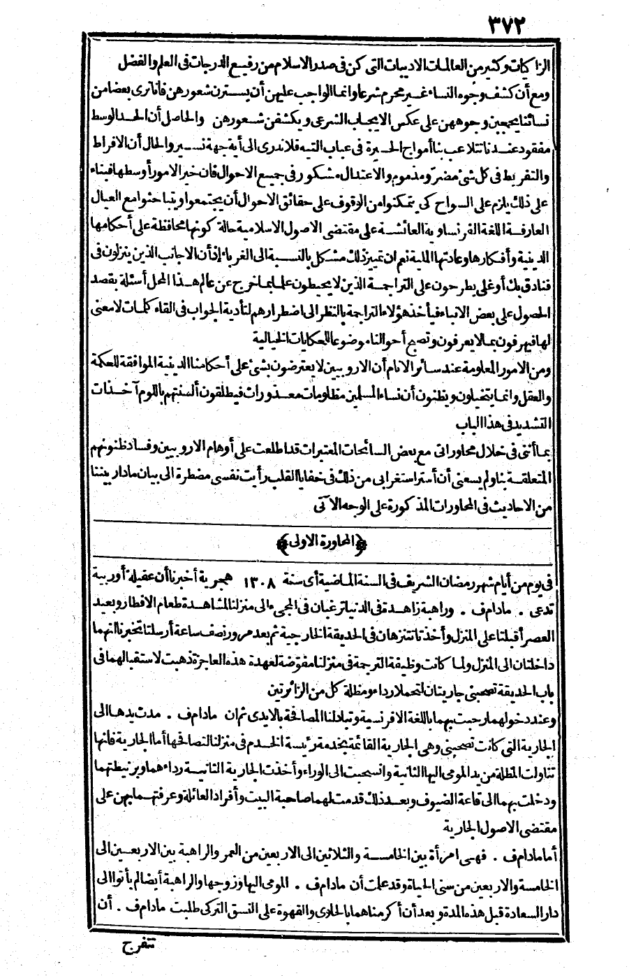 بما أنني في خلال محاوراتي مع بعض السائحات المعتبرات قد اطلعت على أوهام الأوروبيين وفساد ظنونهم المتعلقة بنا، ولم يسعني ان أستر استغرابي من ذلك في خفايا القلب ورأيت نفسي مضطرة إلى بيان ما دار بيننا من الأحاديث في المحاورات المذكورة على الوجه الآتي: المحاورة الأولى في يوم من أيام شهر رمضان الشريف في السنة الماضية أي سنة 1308 هجرية أخبرنا أن عقيلة أوروبية تدعى (مادام ف.) ، وراهبة زاهدة في الدنيا ترغبان في المجيء إلى منزلنا لمشاهدة طعام الإفطار، وبعيد العصر أقبلنا على المنزل وأخذتا تتنزهان في الحديقة الخارجية، ثم بعد مرور نصف ساعة أرسلتا تخبرنا أنهما داخلتان إلى المنزل، ولما كانت وظيفة الترجمة في منزلنا مفوضة لعهدة هذه العاجزة ذهبت لاستقبالهما في باب الحديقة تصحبني جاريتان لتحملا رداء ومظلة كل من الزائرتين.