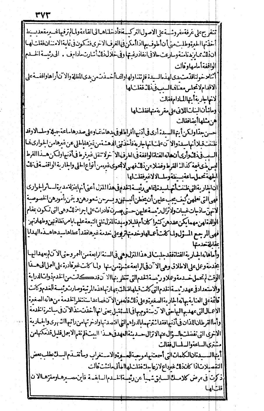 فقالت: حسن جدا ولكن أيتها السيدة أرى في أذنيها أقراطا وفي يدها خاتما، وعلى صدرها ساعة جميلة وسلسالا وقد ظننت قبلا أنها سيدة والآن علمت إنها جارية فأخذتني الدهشة من تميزها بالحلي عن غيرها من الجواري فما السبب في ذلك وأرى أن هاته الفتاة الواقفة في الطرف الآخر لا تنقل غير قرط في أذنيها ولكن هذا القرط ليس بذي قيمة كذاك القرط، وفضلا عن ذلك فهي لا تحوي غيره من أنواع الحلي، والجارية الواقفة في تلك الجهة تحمل ساعة بسيطة وسلسالا لا غير. فقلت لها: إن الجارية التي ظننت أنها سيدة فنما هي رئيسة الخدم في هذا المنزل - أعني أنها بمنزلة مديرة لسائر الجواري - فهي التي تعلمهن كيف يجب عليهن أن يخطن ألبستهن ويسرحن شعورهن ويقمن بأمورهن الخصوصية لأنهن ساذجات غبيات، ولا تزال رئيسة عليهن حتى يصرن قادرات على إجراء ذلك وهي التي تكون بمقام الوالدة لهن مهما يكن عددهن كثيرا كان أم قليلا وسيدة المنزل تلقي التبعة عليها بأمر نظافتهن وطهارتهن فهي المرجع المسؤول ولما كانت أعمالها وخدمتها تربو على خدمة غيرها فقد أعطاها سيدها هذه الهدايا بمقابلة خدمتها.