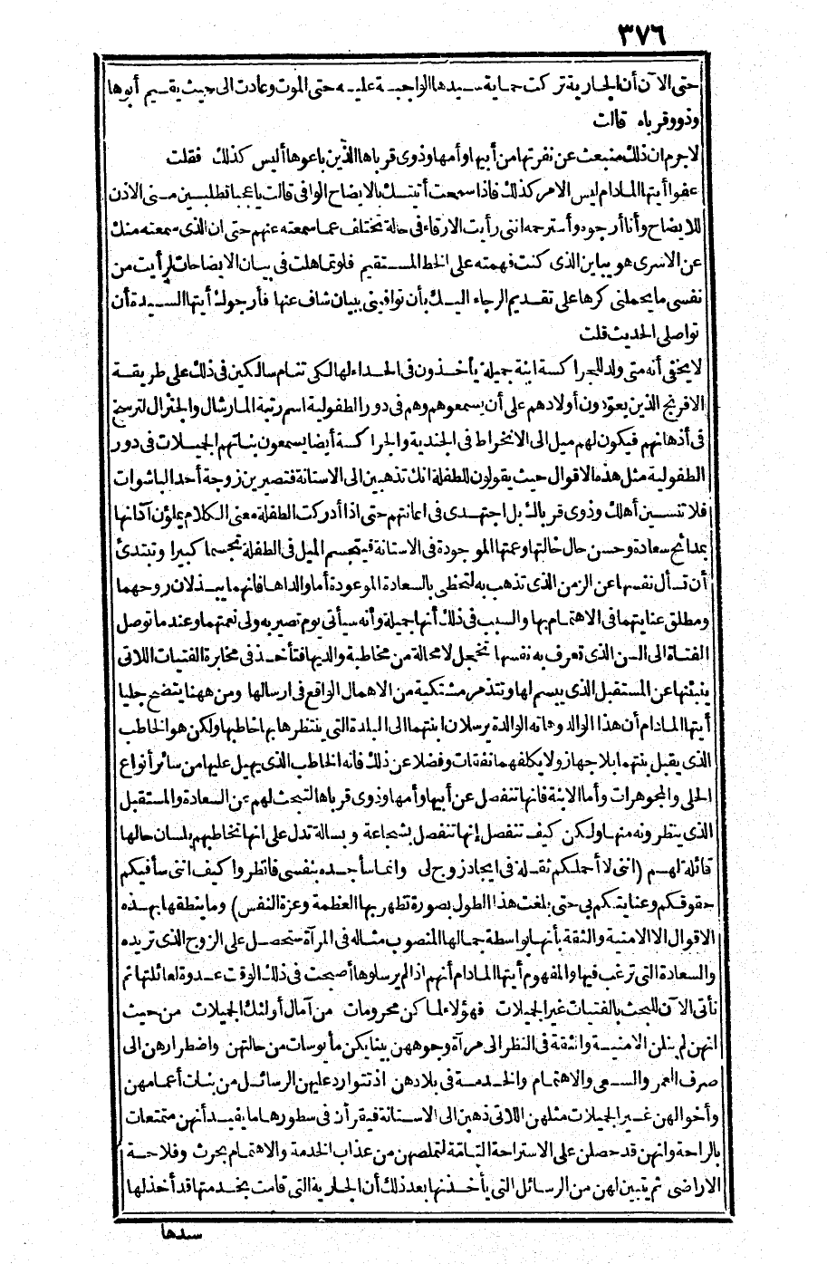 قلت: لا يخفى أنه متى ولد للجراكسة ابنة جميلة يأخذون في الحداء لها لكي تنام سالكين في ذلك على طريقة الإفرنج الذي يعودون أولادهم على أن يسمعوهم وهم في دور الطفولية اسم رتبة المارشال والجنرال لترسخ في أذهانهم فيكون لهم ميل إلى الانخراط في الجندية، والجراكسة أيضا يسمعون بناتهم الجميلات في دور الطفولية مثل هذه الأقوال حيث يقولون للطفلة إنك تذهبين إلى الأستانة فتصيرين زوجة أحد الباشوات فلا تنسين أهلك وذوي قرباك بلا اجتهدي في إعانتهم، حتى إذا أدركت الطفلة معنى الكلام يملؤون آذانهم بمدائح سعادة وحسن حال خالتها وعمتها الموجودة في الأستانة فيتجسم الميل في الطفلة تجسما كبيرا، وتبتدئ أن تسأل نفسها عن الزمن الذي تذهب به لتحظى بالسعادة الموعودة.