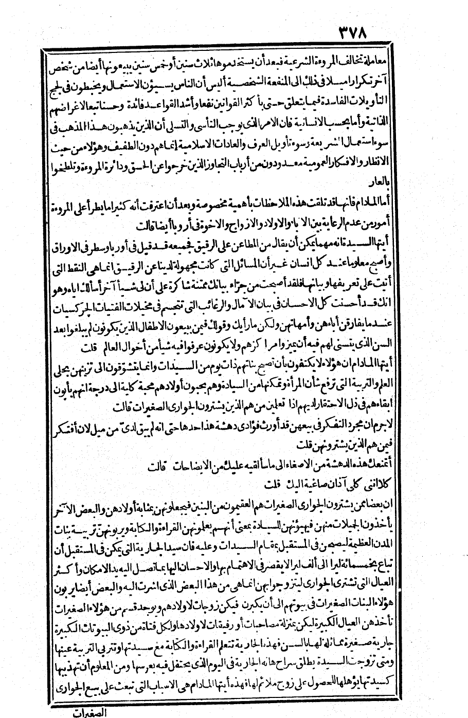 ألي أن الناس [يسيئون] الاستعمال ويخبطون في لجج التأويلات الفاسدة فيما يتعلق حتى بأكثر القوانين نفعا وأشد القواعد فائدة وحسنا تبعا لأغراضهم الذاتية؟ وأما بحسب الإنسانية فإن الأمر الذي يوجب التأسي والتسلي أن الذين يذهبون هذا المذهب في سوء استعمال الشريعة وسوء تأويل العرف والعادات الإسلامية إنما هم دون الطفيف وهؤلاء من حيث الأنظار والأفكار العمومية معدودون من أرباب التجاوز الذين خرجوا عن الحق ودائرة المروءة وتلطخوا بالعار.