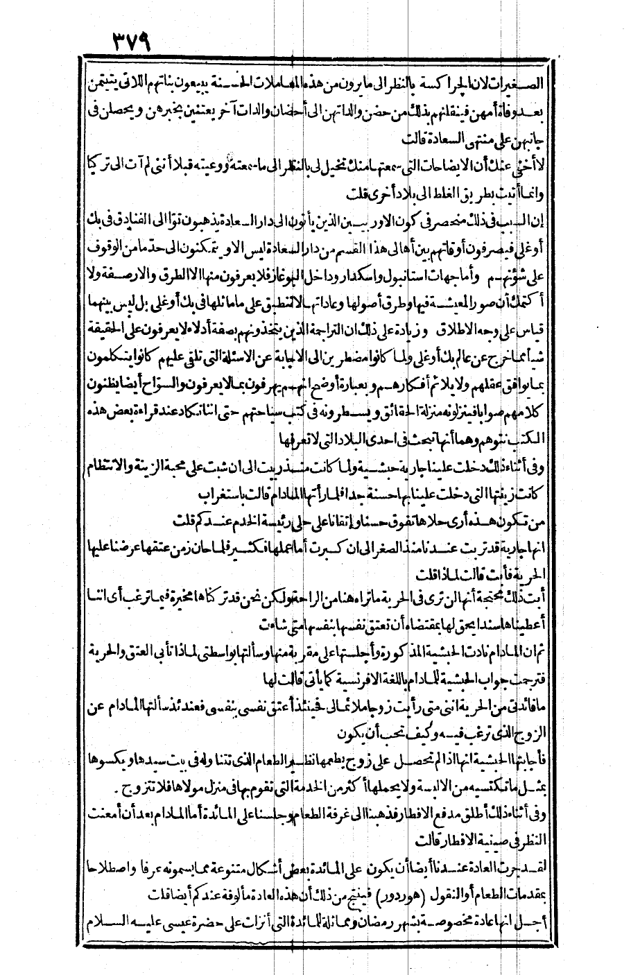 فأجابتها الحبشية: إنها إذا لم تحصل على زوج يطعمها نظير الطعام الذي تتناوله في بيت سيدها ويكسوها بمثل ما تكتسيه من الألبسة، ولا يحملها أكثر من الخدمة التي تقوم بها في منزل مولاها فلا تتزوج.