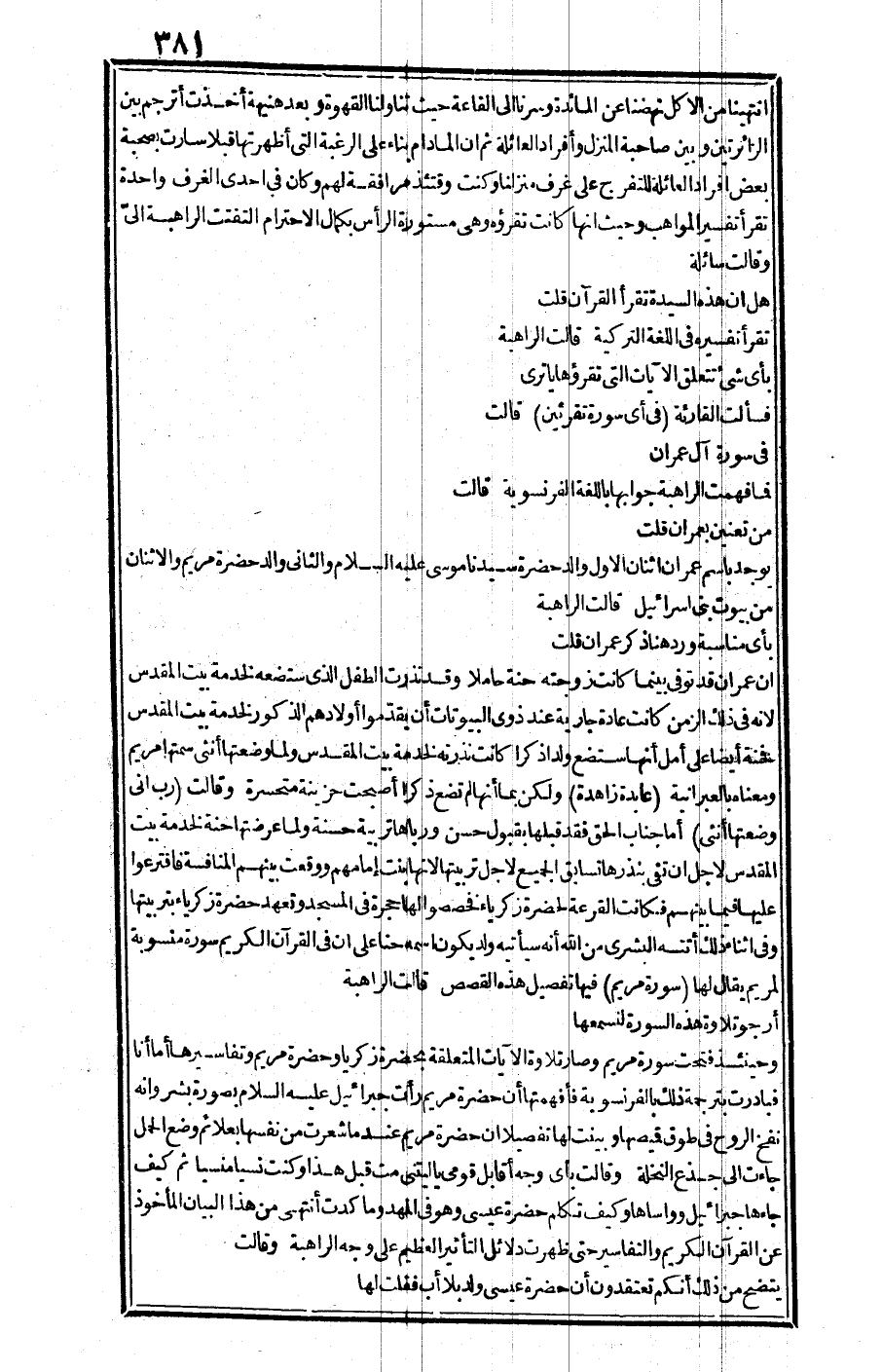 قالت الراهبة: بأي مناسبة ورد هنا ذكر عمران؟ قلت: إن عمران قد توفي بينما كانت زوجته حنة حاملا، وقد نذرت الطفل الذي ستضعه لخدمة بيت المقدس لأنه في ذلك الزمن كانت عادة جارية عند ذوي البيوتات أن يقدموا أولادهم الذكور لخدمة بيت المقدس فحنة أيضا على أمل أنها ستضع ولدا ذكرا كانت نذرته لخدمة بيت المقدس، ولما وضعتها أنثى سمتها مريم ومعناه بالعبرانية (عابدة زاهدة) ، ولكن بما إنها لم تضع ذكر أصبحت حزينة متحسرة. وقالت: (رب إني وضعتها أنثى) (آل عمران: 36) أما جناب الحق فقد قبلها بقبول حسن ورباها تربية حسنة، ولما عرضتها حنة لخدمة بيت المقدس لأجل أن تفي بنذرها تسابق الجميع لأجل تربيتها لأنها بنت إمامهم ووقعت بينهم المنافسة فاقترعوا عليها فيما بينهم، فكانت القرعة لحضرة زكريا فخصصوا لها حجرة في المسجد وتعهد حضرة زكرياء بتربيتها، وفي أنا ذلك أتته البشرى من الله أنه سيأتيه ولد يكون اسمه حنا على أن في القرآن الكريم سورة منسوبة لمريم يقال لها: (سورة مريم) فيها تفصيل هذه القصص.