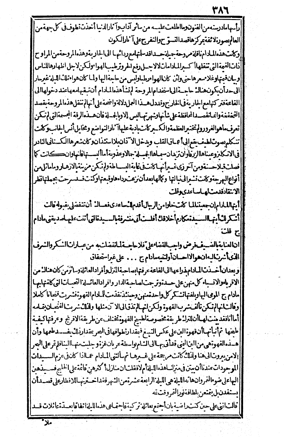 وبعد أن أخذت المدام بذراعها إلى القاعة عرفتها بصاحبة المنزل وأفراد العائلة وسائر من كان من الأقرباء والأنسباء كل منهن على حدة وترجمت لصاحبة الدار وأفراد العائلة التحيات التي كلفتها بها مدام ج. المومى إليها وبلغتها تشكر كل واحدة منهن وحينئذ تقدمت للمدام القهوة فشربت فنجانا كاملا وقالت: إنها مل تكن تألف شرب القهوة ولكن إنها لم تذق إلى الآن مثلها، ولذلك شربت الفنجان بتمامه أما أنا فقد بينت لها أن للترك طريقة مخصوصة لطبيخ القهوة تختلف عن طريقة الإفرنج وعرفتها كيفية طبخها، ثم أنبأتها أن القهوة هي من البن عكس التبغ فبمقدار تطوافها في البحر بمقدار ذلك يفسد طعمها، وأن هذه القهوة هي من البن اليمني قد أتى بها إلى الشام بواسطة عربان غزة وجلبت منها إلينا فلم تمر على البحر إلا من بيروت إلى هنا ولذلك كانت مرجحة على غيرها، ثم سألتني المدام عما إذا كان في عزم السيدات الموجودات عندنا أن يبتن في منزلنا هذه الليلة أم لا فقلت: أن منازل أكثرهن قائمة على الخليج فسيذهبن إليها على ضوء القمر وأن هاته الليلة هي الليلة الرابعة عشرة من الشهر فقد اخترنها للإفطار على قصد أن يستفدن بل يتمتعن بلطافة نور القمر وقت تمه.