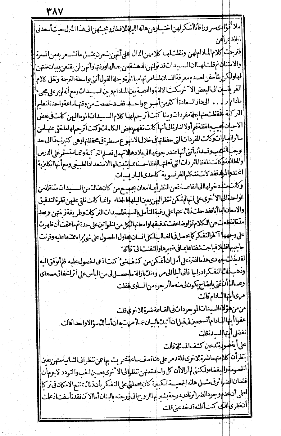 وجملة القول: إنني بواسطة الترجمة ونقل كلام الفريقين إلى البعض الآخر مكنت اللغة والصحبة بين المدام وبين السيدات ومع أنه لم يمر على مجيء مدام ر. ... إلى دار السعادة أكثر من أسبوع واحد فقد خصصت من وقتها ساعة واحدة لتعليم التركية فحفظت منها جملة مفردات، وبينا كنت أترجم لها كلام السيدات المومى إليهن كانت في بعض الأحيان تجيب بلفظة نعم أو لا إشارة إلى أنها كانت تفهم بعض الكلمات، وكنت أترجم لها ما خفي عنها من سائر العبارات، وكانت المفردات التي حفظتها في خلال أسبوع مسطرة في محفظتها وهي كثيرة جدا إلى حد يوجب التعجب وقد أنبأتني أنها عند رجوعها إلى بلادها لا تهمل تعلم التركية وإنما ستستمر على الدرس والمطالعة، وكانت تلفظ المفردات التي تعلمتها لفظا حسنا مما يثبت لها الاستعداد الطبيعي ومع أنها إنكليزية المحتد والمولد فقد كانت تتكلم الفرنسية كإحدى الباريسيات.