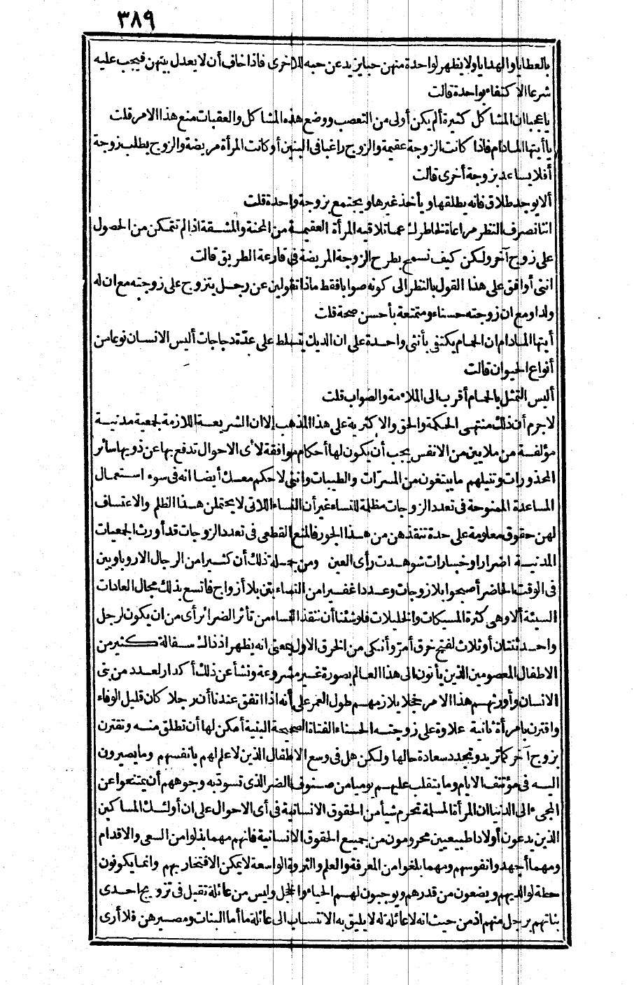 قلت: إننا نصرف النظر مراعاة لخاطرك عما تلاقيه المرأة العقيمة من المحنة والمشقة إذا لم تتمكن من الحصول على زوج آخر ولكن كيف نسمح بطرح الزوجة المريضة في قارعة الطريق؟ قالت: إنني أوافق على هذا القول بالنظر إلى كونه صوابا فقط ماذا تقولين عن رجل يتزوج على زوجته مع أنه ولدا ومع أن زوجته حسناء ومتمتعة بأحسن صحة؟ قلت: أيتها المدام إن الحمام يكتفي بأنثى واحدة على أن الديك يتسلط على عدة دجاجات أليس الإنسان نوعا من أنواع الحيوان؟ قالت: أليس التمثل بالحمام أقرب إلى الملاءمة والصواب؟ قلت: لا جرم أن ذلك منتهى الحكمة والحق والأكثرية على هذا المذهب إلا أن الشريعة اللازمة لجمعية مدينة مؤلفة من ملايين من النفس يجب أن يكون لها أحكام موافقة لأي الأحوال تدفع بها عن ذويها سائر المحذورات وتنيلهم ما يبتغون المسرات والطيبات وإنني لأحكم معك أيضا أنه في سوء استعمال المساعدة الممنوحة في تعدد الزوجات مظلمة للنساء غير أن النساء اللاتي لا يحتلمن هذا الظلم والاعتساف لهن حقوق معلومة على حدة تنقذهن من هذا الجور، فالمنع القطعي في تعدد الزوجات قد أورث الجمعيات المدنية أضرارا وخسارات شوهدت رأى العين.