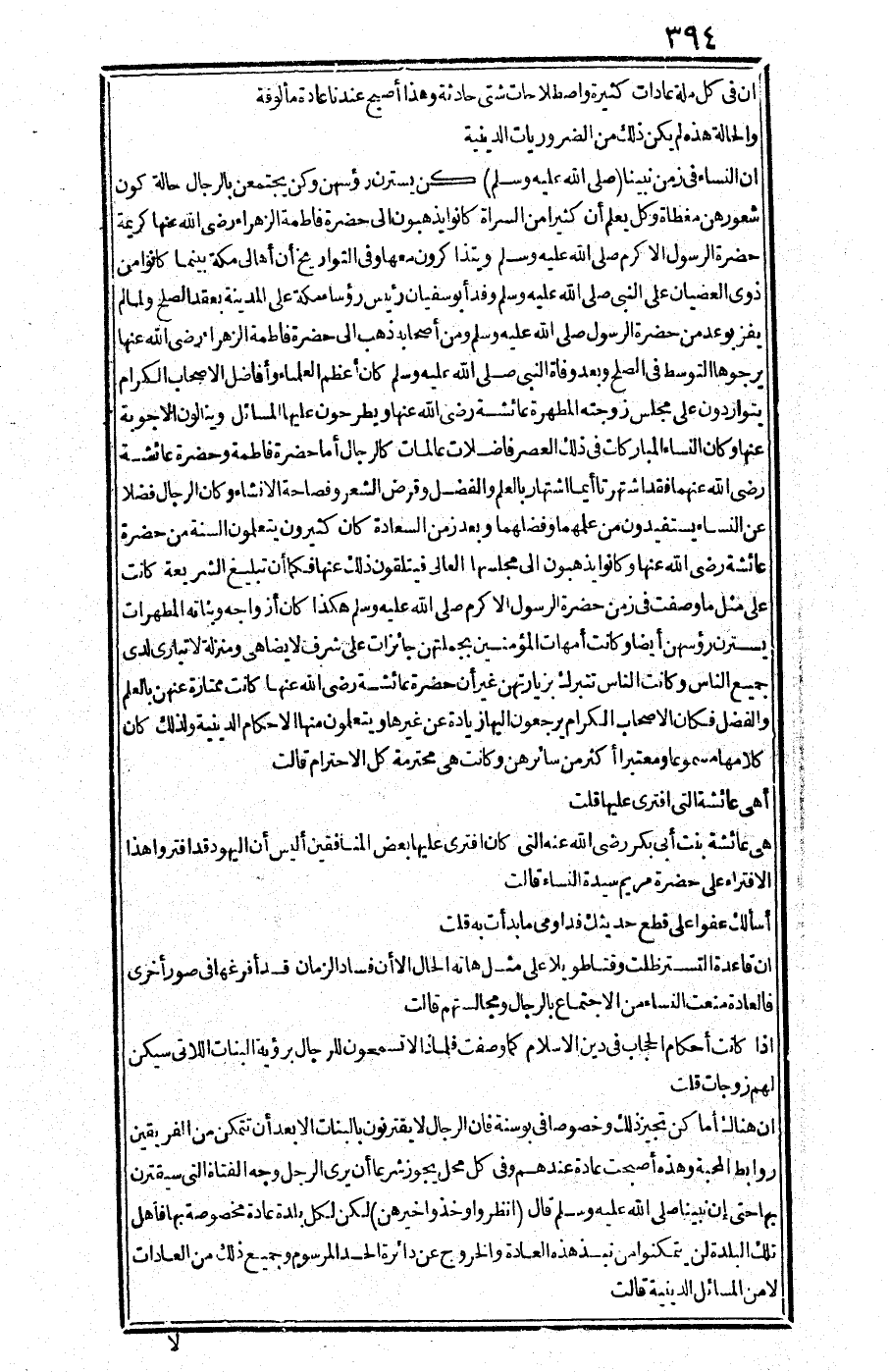 إن النساء في زمن نبينا صلى الله عليه وسلم كن يسترن رؤوسهن وكن يجتمعن بالرجال حالة كون شعورهن مغطاة وكل يعلم أن كثيرا من السراة كانوا يذهبون إلى حضرة فاطمة الزهراء - رضي الله عنها - كريمة حضرة الرسول الكرم صلى الله عليه وسلم ويتذاكرون معها. وفي التواريخ أن أهالي مكة بينما كانوا من ذوي العصيان على النبي صلى الله عليه وسلم وفد أبو سفيان رئيس رؤساء مكة على المدينة يعقد الصلح، ولما لم يفز بوعد من حضرة الرسول صلى الله عليه وسلم ومن أصحابه ذهب إلى حضرة فاطمة الزهراء - رضي الله علنها - يرجوها التوسط في الصلح وبعد وفاة النبي صلى الله عليه وسلم كان أعظم العلماء وأفاضل الأصحاب الكرام يتواردون على مجلس زوجته المطهرة عائشة - رضي الله عنها - ويطرحون عليها المسائل وينالون الأجوبة عنها، وكان النساء المباركات في ذلك العصر فاضلات عالمات كالرجال، أما حضرة فاطمة وحضرة عائشة - رضي الله عنهما - فقد اشتهرتا أيما اشتهار بالعلم والفضل، وقرض الشعر، وفصاحة الإنشاء.