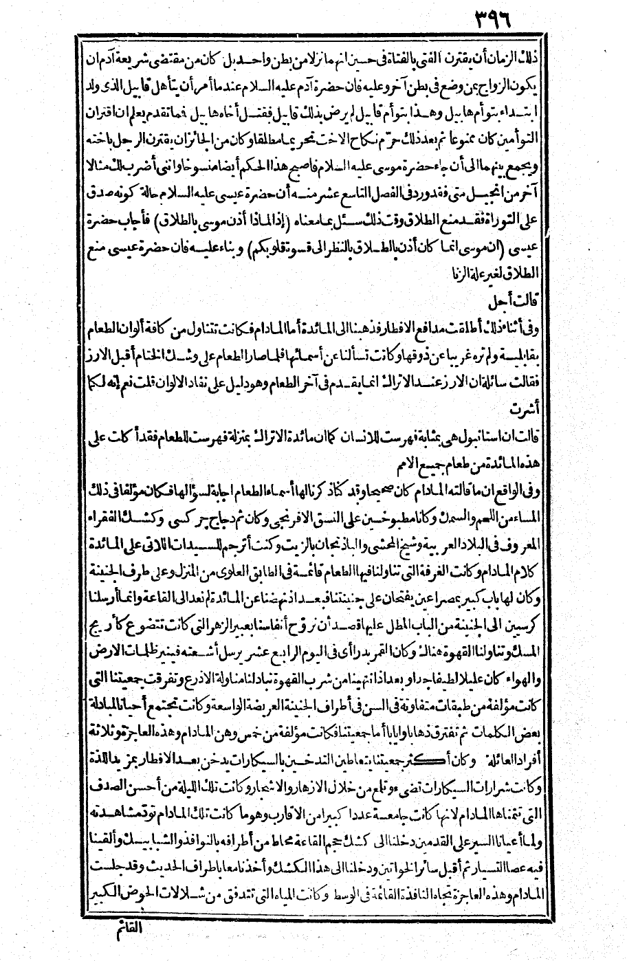 وفي الواقع إن ما قالته المدام كان صحيحا وقد كنا ذكرنا لها أسماء الطعام إجابة لسؤالها فكان مؤلفا في ذلك المساء من اللحم والسمك وكانا مطبوخين على النسق الإفرنجي وكان ثم دجاج جركسي وكشك الفقراء المعروف في البلاد العربية وشيخ المحشي والباذنحان بالزيت، وكنت أترجم للسيدات اللاتي على المائدة كلام المدام وكانت الغرفة التي تناولنا فيها لطعام قائمة في الطابق العلوي من المنزل وعلى طرف الجنينة وكان لها باب كبير بمصراعين يفتحان على جنينتها فبعد إذ نهضنا عن المائدة لم نعد إلى القاعة وإنما أرسلنا كرسيين إلى الجنينة من الباب المطل عليها قصد أن نروح أنفاسنا بعبير الزهر التي كانت تتضوع كأريج المسك وتناولنا القهوة هناك وكان القمر بدرا، (أي في اليوم الرابع عشر يرسل أشعته فينير ظلمات الأرض) والهواء كان عليلا لطيفا جدا.