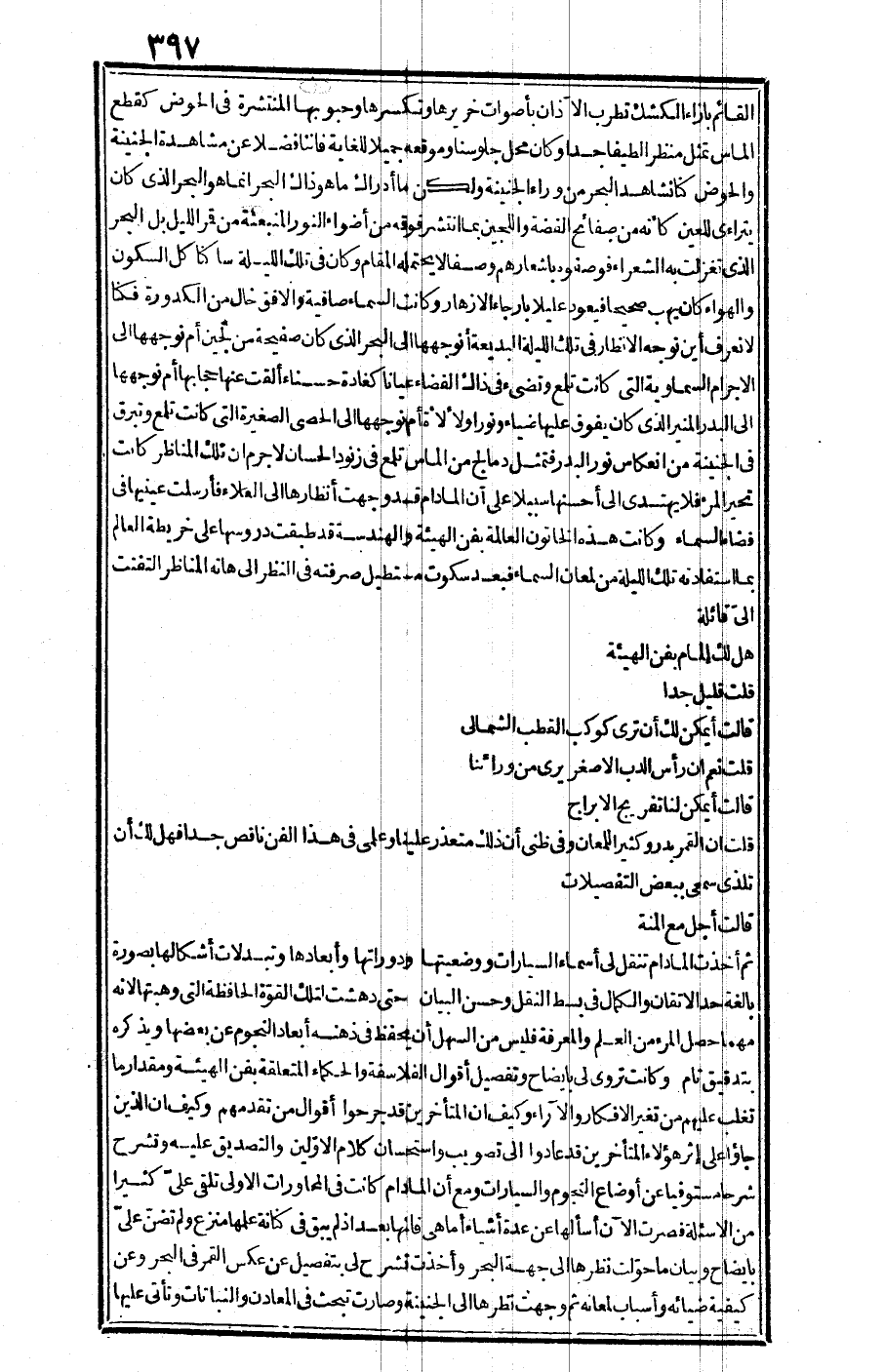 وكانت تروي لي بإيضاح وتفصيل أقوال الفلاسفة والحكماء المتعلقة بفن الهيئة ومقدار ما تغلب عليهم من تغير الأفكار والآراء وكيف أن المتأخرين قد جرحوا أقوال من تقدمهم وكيف أن الذين جاءوا على إثر هؤلاء المتأخرين قد عادوا إلى تصويب واستحسان كلام الأولين والتصديق عليه وتشرح شرحا مستوفيا عن أوضاع النجوم السيارات ومع أن المدام كانت في المحاورات الأولى تلقى علي كثيرا من الأسئلة فصرت الآن أسألها عن عدة أشياء، أما هي فإنها بعد إذ لم يبق في كنانة علمها منزع ولم تضن علي بإيضاح وبيان ما حولت نظرها إلى جهة البحر وأخذت تشرح لي بتفصيل عن عكس القمر في البحر وعن كيفية ضيائه وأسباب لمعانه، ثم وجهت نظرها إلى الجنينة وصارت تبحث في المعادن والنباتات وتأتي عليها