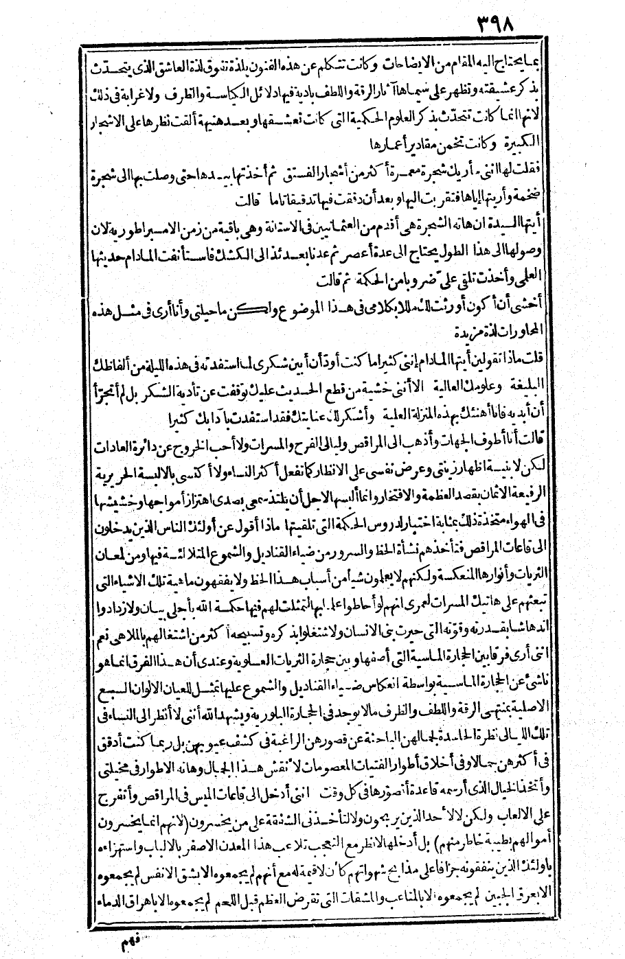 قلت: ماذا تقولين أيتها المدام إنني كثيرا ما كنت أود أن أبين شكري لما استفدته في هذه الليلة من ألفاظك البليغة وعلومك العالية إلا أنني خشية من قطع الحديث عليك توقفت عن تأدية الشكر، بل لم أتجرأ أن أبديه فانا أهنئك بهذه المنزلة العلية، وأشكر لك عنايتك فقد استفدت بآدابك كثيرا.