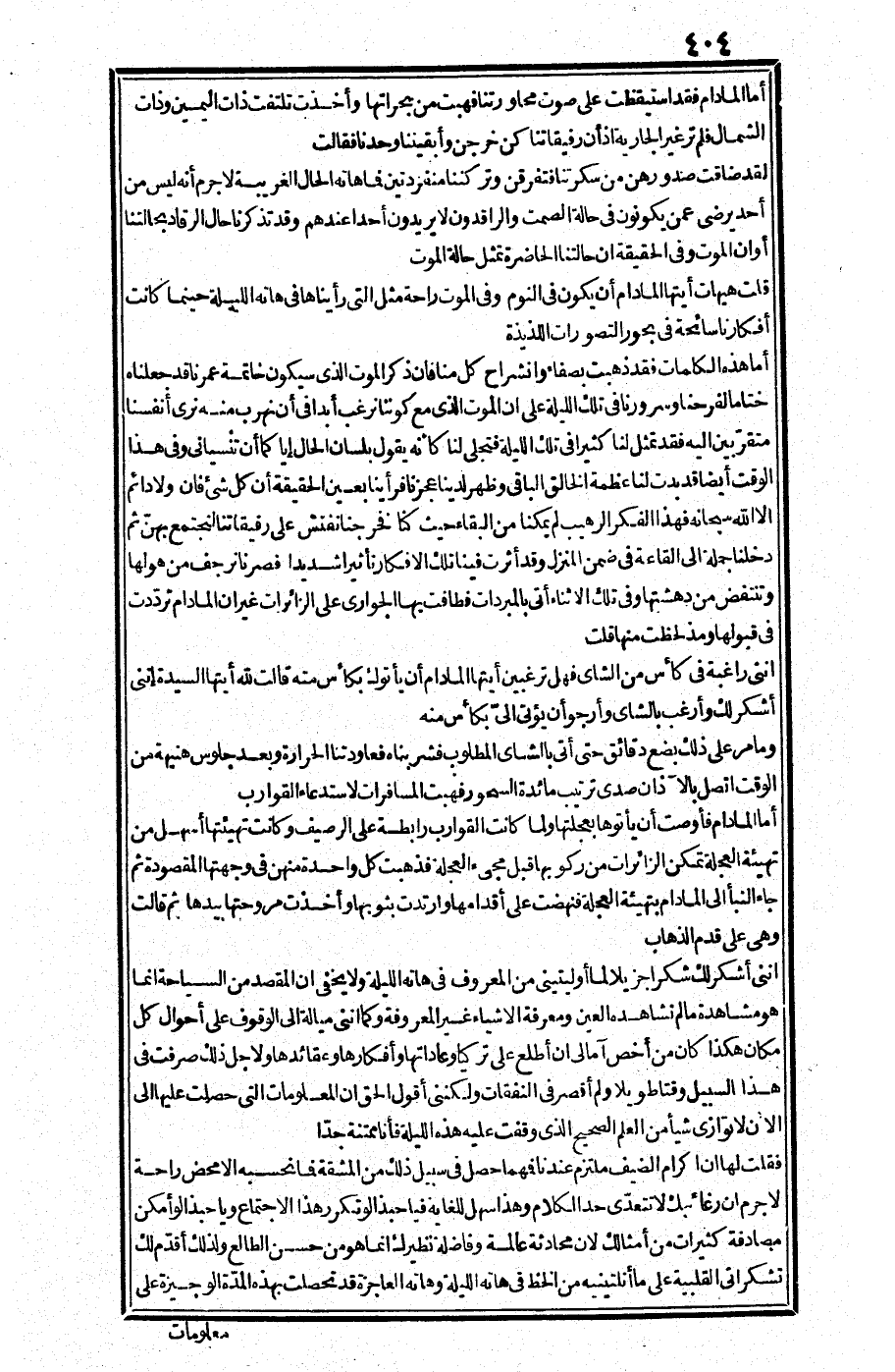 قلت: هيهات أيتها المادام أن يكون في النوم وفي الموت راحة مثل التي رأيناها في هاته الليلة حينما كانت أفكارنا سائحة في بحور التصورات اللذيذة.