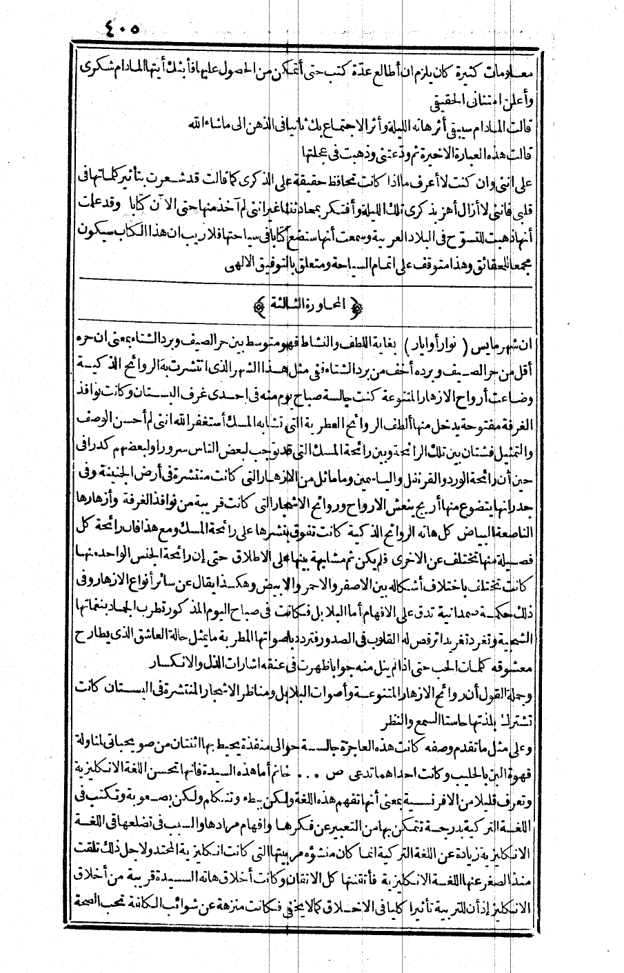 إن شهر مايس (نوار, أو أيار) بغاية اللطف والنشاط فهو متوسط بين حر الصيف وبرد الشتاء بمعنى أن حره أقل من حر الصيف وبرده أخف من برد الشتاء، ففي مثل هذا الشهر الذي انتشرت به الروائح الزكية وضاعت أرواح الأزهار المتنوعة كنت جالسة صباح يوم منه في إحدى عرف البستان وكانت نوافذ الغرفة مفتوحة يدخل منها ألطف الروائح العطرية التي تشبه المسك أستغفر الله إنني لم أحسن الوصف والتمثيل، فشتان بين تلك الرائحة وبين رائحة المسك التي قد توجب لبعض الناس سروراً ولبعضهم كدراً في حين أن رائحة الورد والقرنفل والياسمين وما ماثل من الأزهار التي كانت منتشرة في أرض الجنينة وفي جدرانها يتضوع منها أريج ينعش الأرواح، ورائحة الأشجار التي كانت قريبة من نوافذ الغرفة وأزهارها الناصعة البياض كل هاته الروائح الزكية كانت تفوق بنشرها على رائحة المسك، ومع هذا فإن رائحة كل فصيلة منها تختلف عن الأخرى فلم يكن ثمة مشابهة بينها الإطلاق، حتى أن رائحة الجنس الواحد منها كانت تختلف باختلاف أشكاله بين الأصفر والأحمر والأبيض، وهكذا يقال عن سائر أنواع الأزهار. وفي ذلك حكمة صمدانية تدق على الأفهام أما البلابل فكانت في صباح اليوم -المذكور- تطرب الجماد بنغماتها الشجية وتغرد تغريداً ترقص له القلوب في الصدور فتردد بأصواتها المطربة ما يمثل حالة العاشق الذي يطارح معشوقه كلمات الحب حتى إذا لم ينل منه جواباً ظهرت في عنقه إشارات الذل والانكسار.