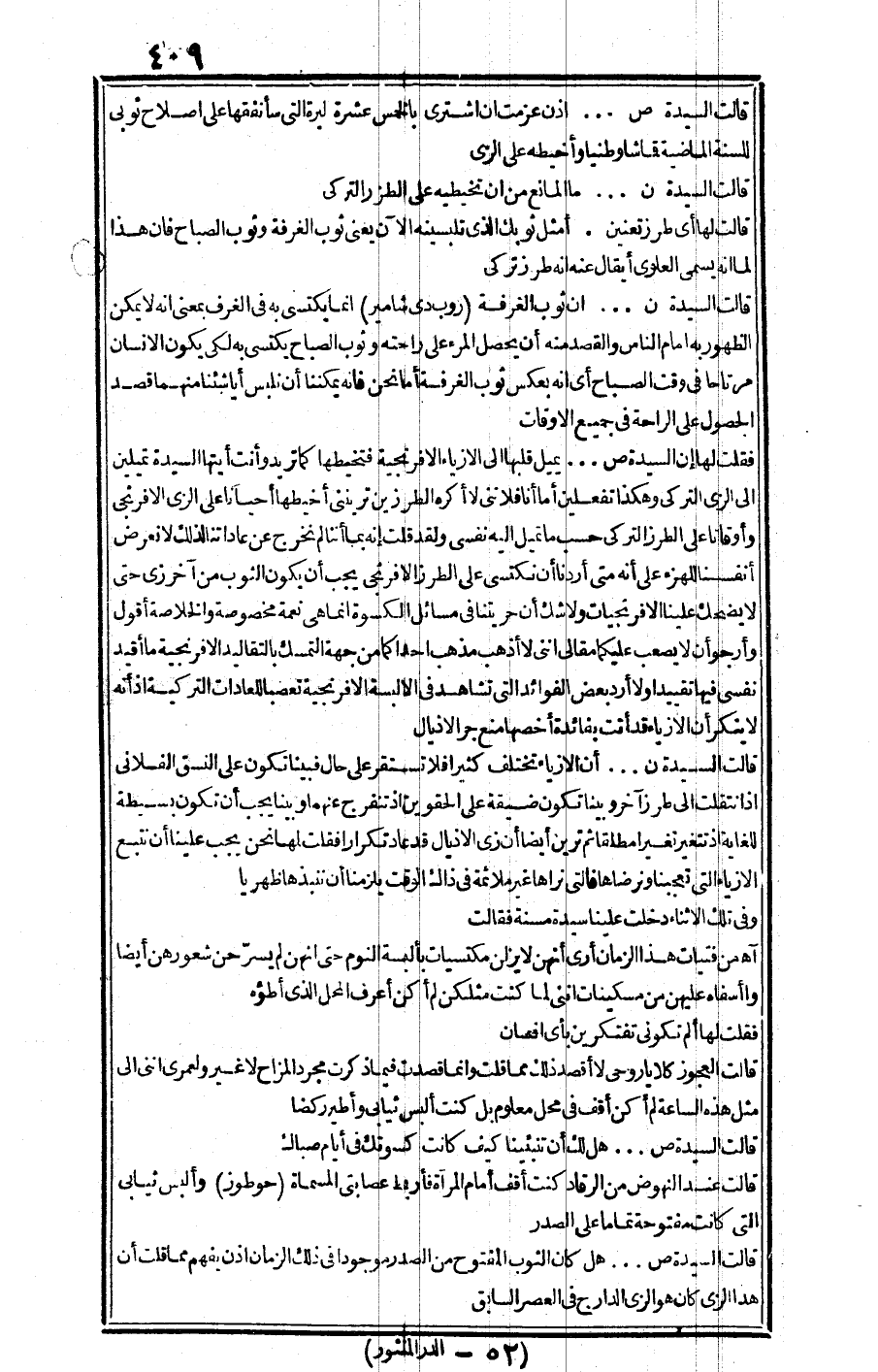 قالت السيدة "ن": إن الأزياء تختلف كثيرا فلا تستقر على حال فيبينا تكون على النسق الفلاني إذ انتقلت إلى طرز آخر وبينا تكون ضيقة على الحقوين إذ تنفرج عنهما وبينا يجب أن تكون بسيطة للغاية إذ تتغير تغيرا مطلقا، ثم ترين أيضا أن زي الأذيال قد عاد تكرارا. فقلت لها: نحن، يجب علينا أن نتبع الأزياء التي تعجبنا ونرضاها فالتي نراها غير ملائمة في ذاك الوقت يلزمنا أن ننبذها ظهريا. وفي تلك الأثناء دخلت علينا سيدة مسنة فقالت: آه من فتيات هذا الزمان أرى أنهن لا يزلن مكتسيات بألبسة النوم حتى أنهن لم يسرحن شعورهن أيضا وا أسفاه عليهن من مسكينات إنني لما كنت مثلكن لم أكن أعرف المحل الذي أطؤه.
