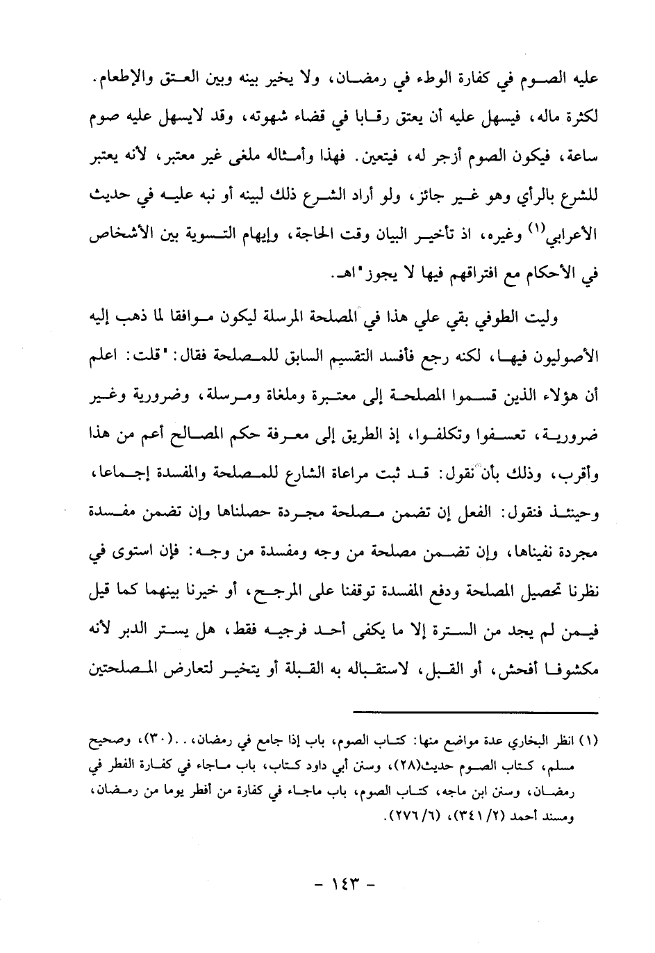 وليت الطوفي بقي علي هذا في المصلحة المرسلة ليكون موافقا لما ذهب إليه الأصوليون فيها، لكنه رجع فأفسد التقسيم السابق للمصلحة فقال:" قلت: اعلم أن هؤلاء الذين قسموا المصلحة إلى معتبرة وملغاة ومرسلة، وضرورية وغير ضرورية، تعسفوا وتكلفوا، إذ الطريق إلى معرفة حكم المصالح أعم من هذا وأقرب، وذلك بأن نقول: قد ثبت مراعاة الشارع للمصلحة والمفسدة إجماعا، وحينئذ فنقول: الفعل إن تضمن مصلحة مجردة حصلناها وإن تضمن مفسدة مجردة نفيناها، وإن تضمن مصلحة من وجه ومفسدة من وجه: فإن استوى في نظرنا تحصيل المصلحة ودفع المفسدة توقفنا على المرجح، أو خيرنا بينهما كما قيل فيمن لم يجد من السترة إلا ما يكفى أحد فرجيه فقط، هل يستر الدبر لأنه مكشوفا أفحش، أو القبل، لاستقباله به القبلة أو يتخير لتعارض المصلحتين