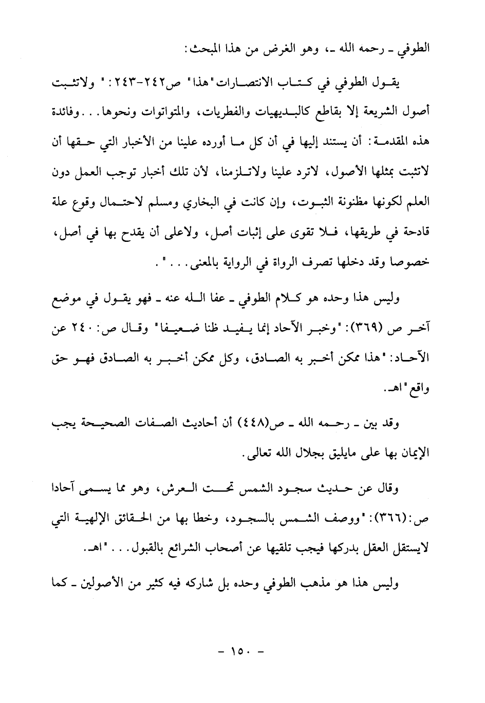 وليس هذا وحده هو كلام الطوفي- عفا الله عنه- فهو يقول في موضع آخر ص (369):" وخبر الآحاد إنما يفيد ظنا ضعيفا" وقال ص: 240 عن الآحاد:" هذا ممكن أخبر به الصادق، وكل ممكن أخبر به الصادق فهو حق واقع" اهـ.