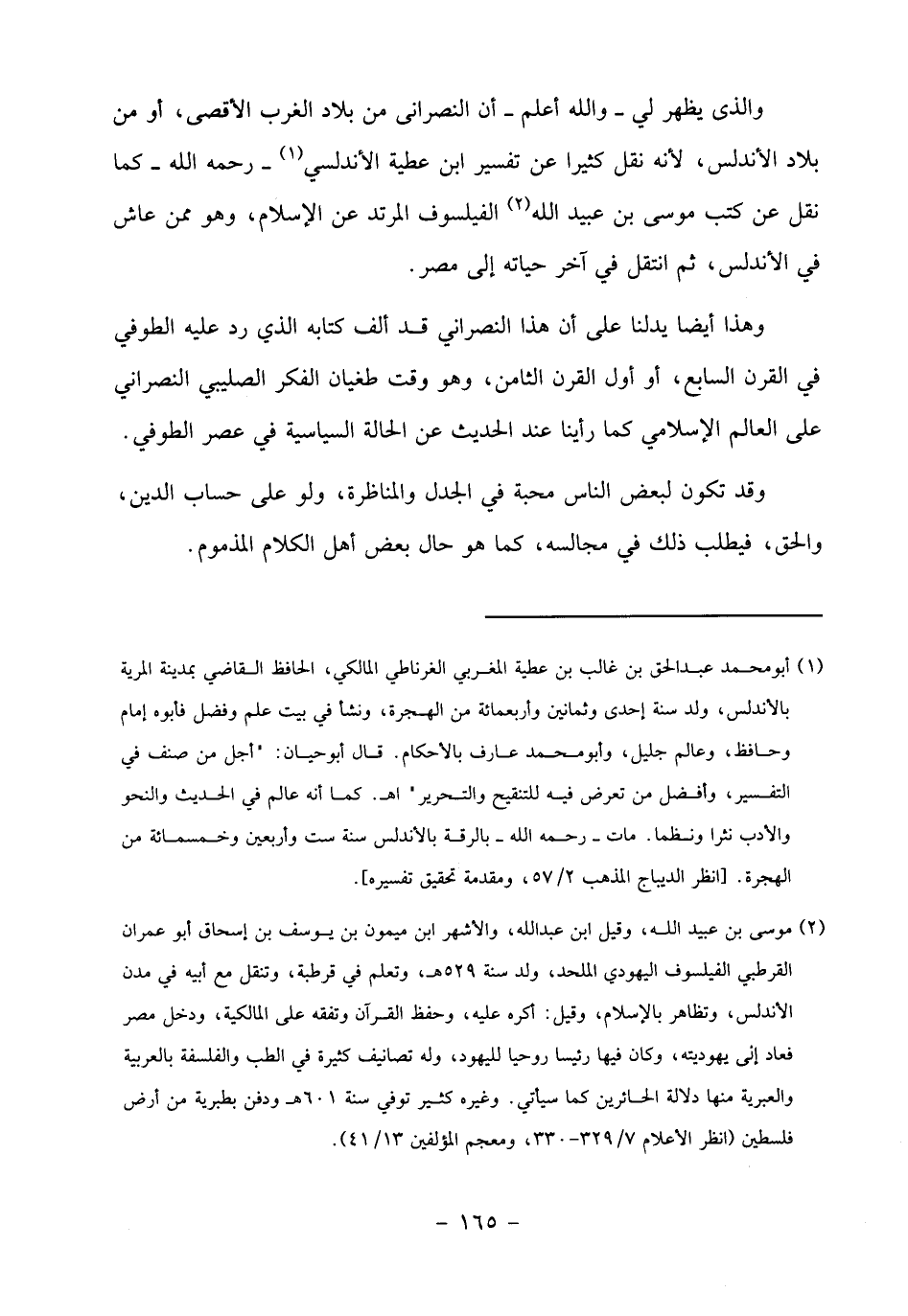 (2) موسى بن عبيد الله، وقيل ابن عبد الله، والأشهر ابن ميمون بن يوسف بن إسحاق أبو عمران القرطبي الفيلسوف اليهودي الملحد، ولد سنة 529 هـ، وتعلم في قرطبة، وتنقل مع أبيه في مدن الأندلس، وتظاهر بالإسلام، وقيل: أكره عليه، وحفظ القرآن وتفقه على المالكية، ودخل مصر فعاد إلى يهوديته، وكان فيها رئيسا روحيا لليهود، وله تصانيف كثيرة في الطب والفلسفة بالعربية والعبرية منها دلالة الحائرين كما سيأتي. وغيره كثير توفي سنة 601 هـ ودفن بطبرية من أرض فلسطين (انظر الأعلام 7/ 329 - 330، ومعجم المؤلفين 13/ 41).