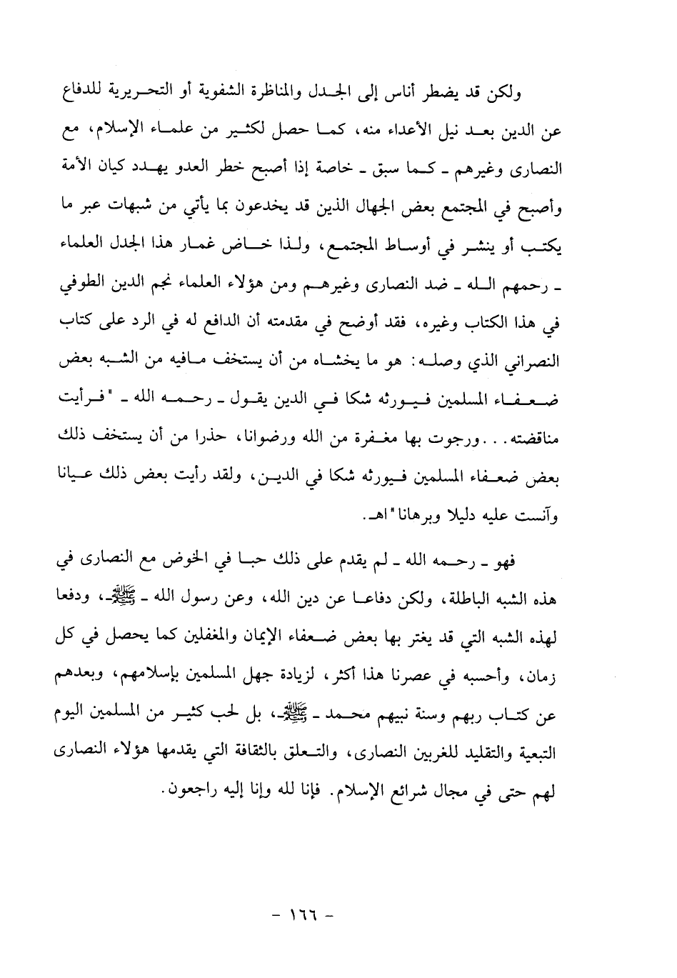 فهو- رحمه الله- لم يقدم على ذلك حبا في الخوض مع النصارى في هذه الشبه الباطلة، ولكن دفاعا عن دين الله، وعن رسول الله- صلّى الله عليه وسلم-، ودفعا لهذه الشبه التي قد يغتر بها بعض ضعفاء الإيمان والمغفلين كما يحصل في كل زمان، وأحسبه في عصرنا هذا أكثر، لزيادة جهل المسلمين بإسلامهم، وبعدهم عن كتاب ربهم وسنة نبيهم محمد- صلّى الله عليه وسلم-، بل لحب كثير من المسلمين اليوم التبعية والتقليد للغربيين النصارى، والتعلق بالثقافة التي يقدمها هؤلاء النصارى لهم حتى في مجال شرائع الإسلام. فإنا لله وإنا إليه راجعون.