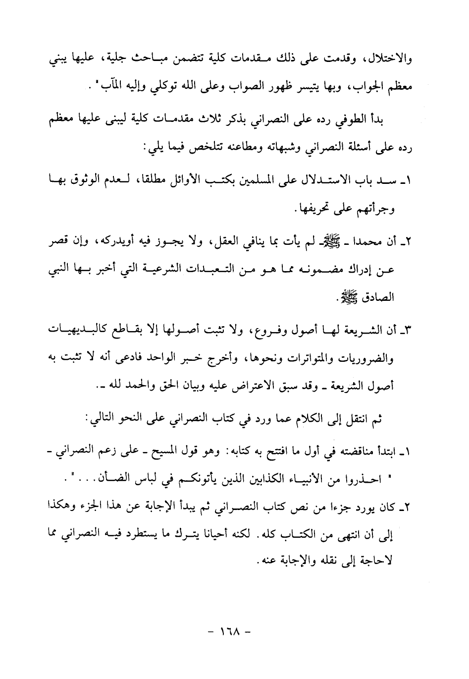 بدأ الطوفي رده على النصراني بذكر ثلاث مقدمات كلية ليبنى عليها معظم رده على أسئلة النصراني وشبهاته ومطاعنه تتلخص فيما يلي: