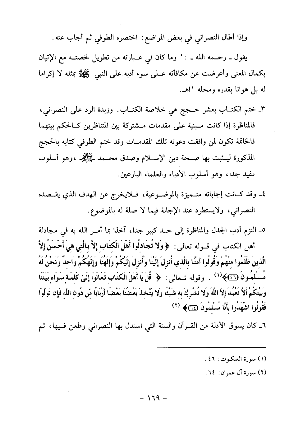 3 - ختم الكتاب بعشر حجج هي خلاصة الكتاب. وزبدة الرد على النصراني، فالمناظرة إذا كانت مبنية على مقدمات مشتركة بين المتناظرين كالحكم بينهما فالخاتمة تكون لمن وافقت دعوته تلك المقدمات وقد ختم الطوفي كتابه بالحجج المذكورة ليثبت بها صحة دين الإسلام وصدق محمد- صلّى الله عليه وسلم-، وهو أسلوب مفيد جدا، وهو أسلوب الأدباء والعلماء البارعين.