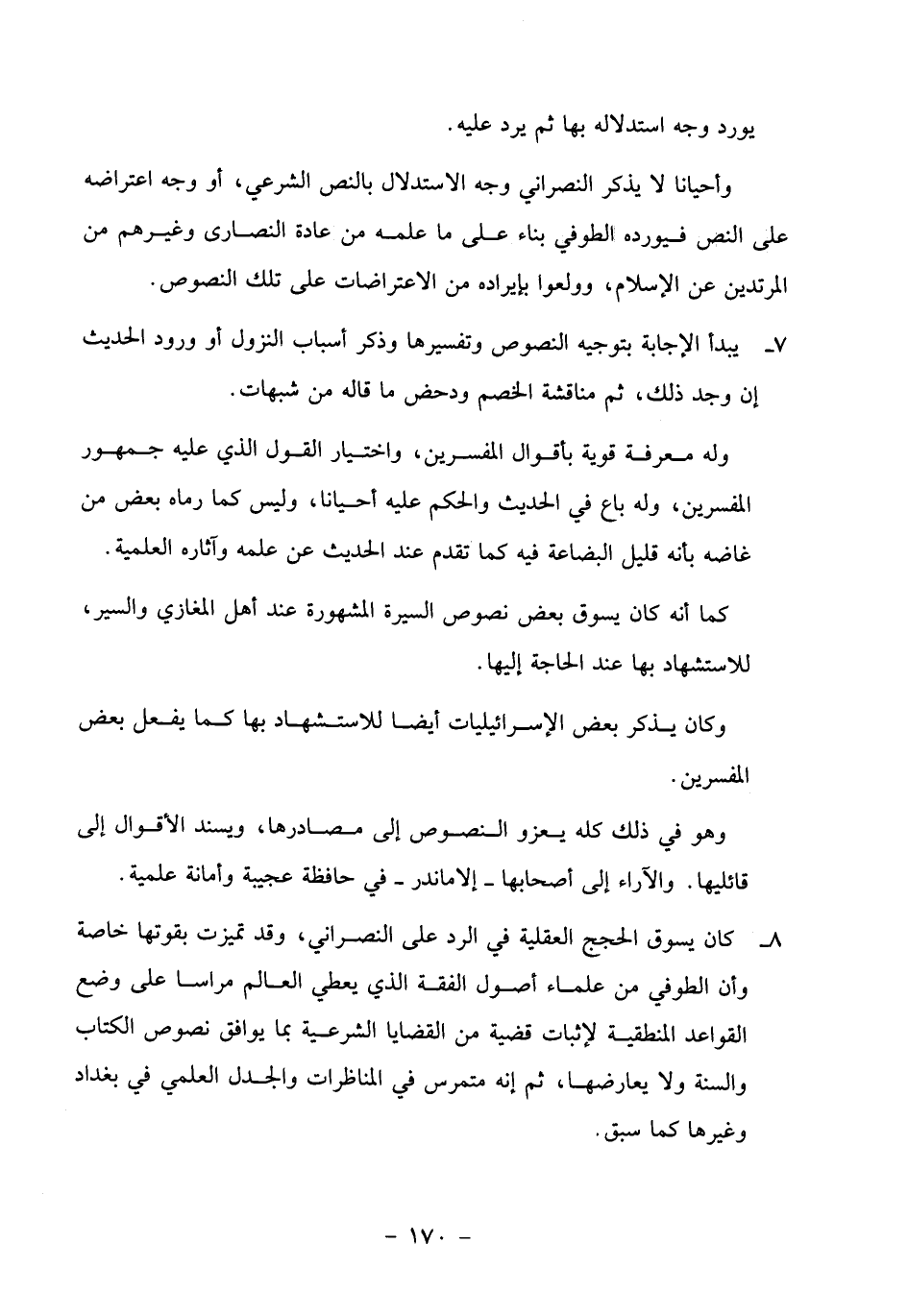8 - كان يسوق الحجج العقلية في الرد على النصراني، وقد تميزت بقوتها خاصة وأن الطوفي من علماء أصول الفقه الذي يعطي العالم مراسا على وضع القواعد المنطقية لإثبات قضية من القضايا الشرعية بما يوافق نصوص الكتاب والسنة ولا يعارضها، ثم إنه متمرس في المناظرات والجدل العلمي في بغداد وغيرها كما سبق.