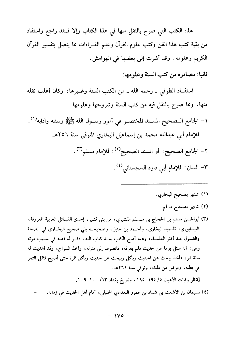 استفاد الطوفي- رحمه الله- من الكتب الستة وغيرها، وكان أغلب نقله منها، ومما صرح بالنقل فيه من كتب السنة وشروحها وعلومها: