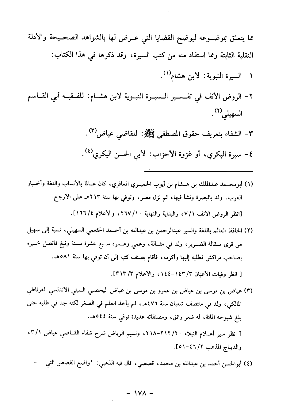 مما يتعلق بموضوعه ليوضح القضايا التي عرض لها بالشواهد الصحيحة والأدلة النقلية الثابتة ومما استفاد منه من كتب السيرة، وقد ذكرها في هذا الكتاب: