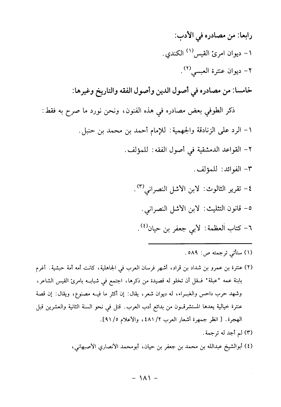 ذكر الطوفي بعض مصادره في هذه الفنون، ونحن نورد ما صرح به فقط: