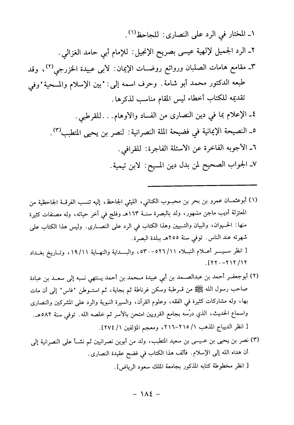 1 - المختار في الرد على النصارى: للجاحظ «1».