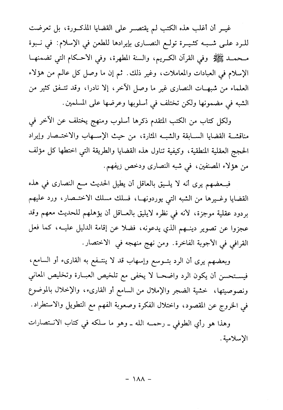 فبعضهم يرى أنه لا يليق بالعاقل أن يطيل الحديث مع النصارى في هذه القضايا وغيرها من الشبه التي يوردونها، فسلك مسلك الاختصار، ورد عليهم بردود عقلية موجزة، لأنه في نظره لا يليق بالعاقل أن يؤهلهم للحديث معهم وقد عجزوا عن تصوير دينهم الذي يدعونه، فضلا عن إقامة الدليل عليه، كما فعل القرافي في الأجوبة الفاخرة. ومن نهج منهجه في الاختصار.
